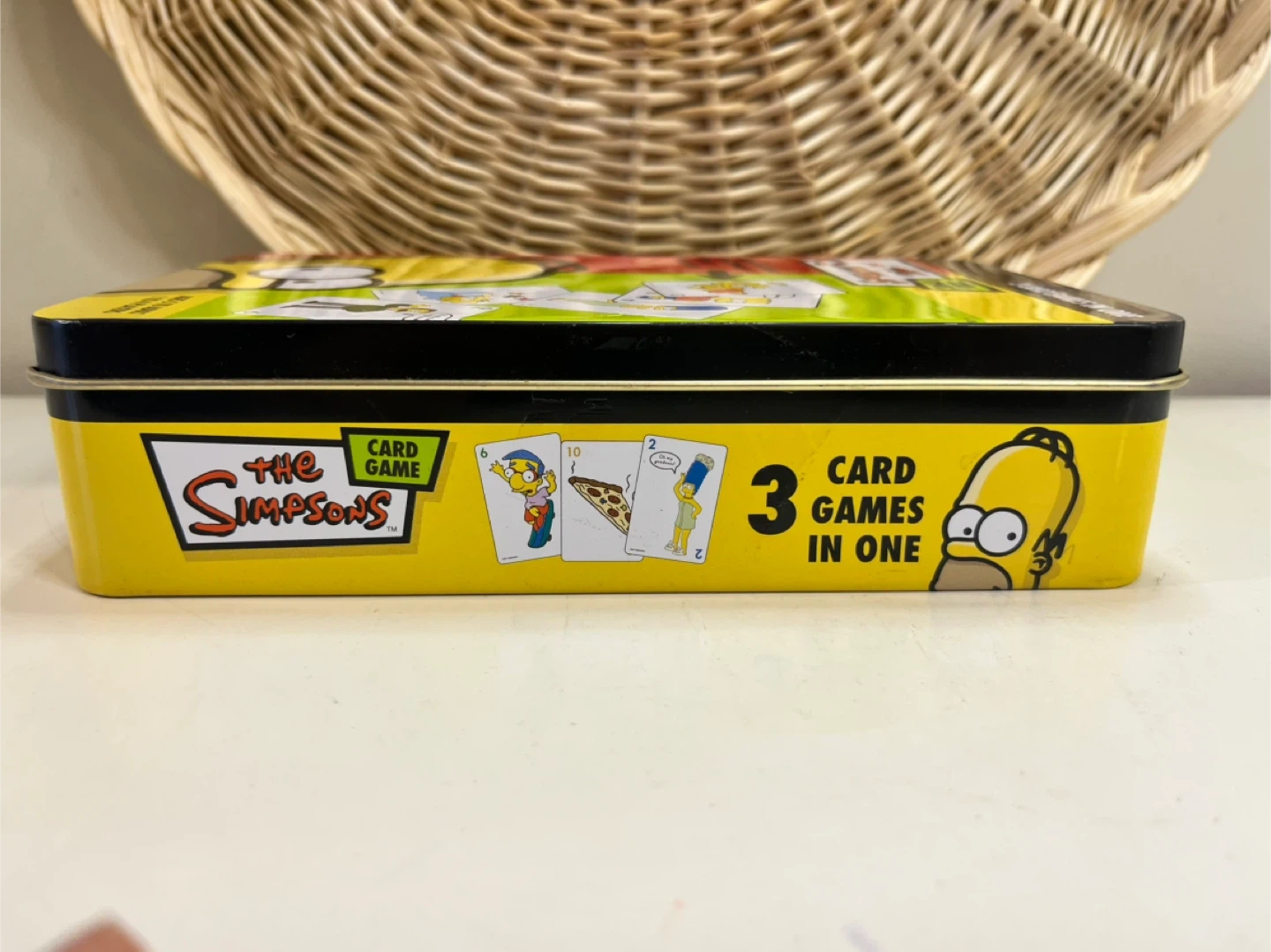 The Simpsons 3 Card Games in One! Includes 56 Cards. Game includes: Bad Memory, Cheat, Crazy Eats. Ages 5 to Adult, 1 to 4 players. The Simpsons cards feature characters from the TV show: Homer, Marge, Bart, Lisa, Maggie, Mr. Burns, Chief Wiggum, and Apu. The Tin box is included