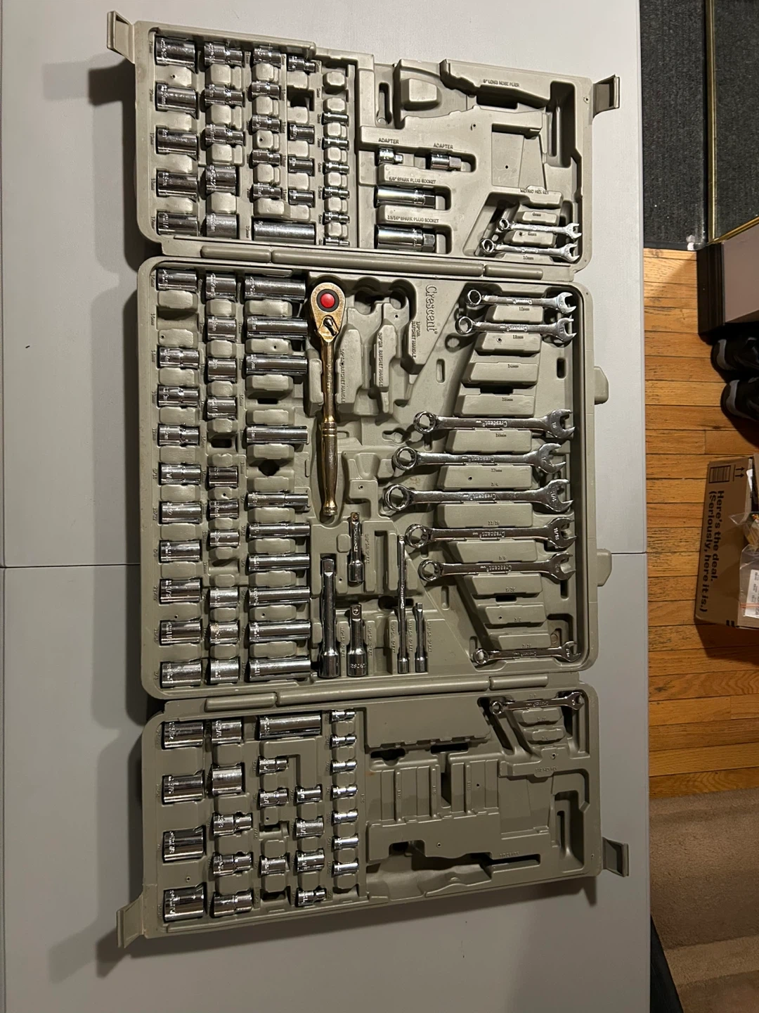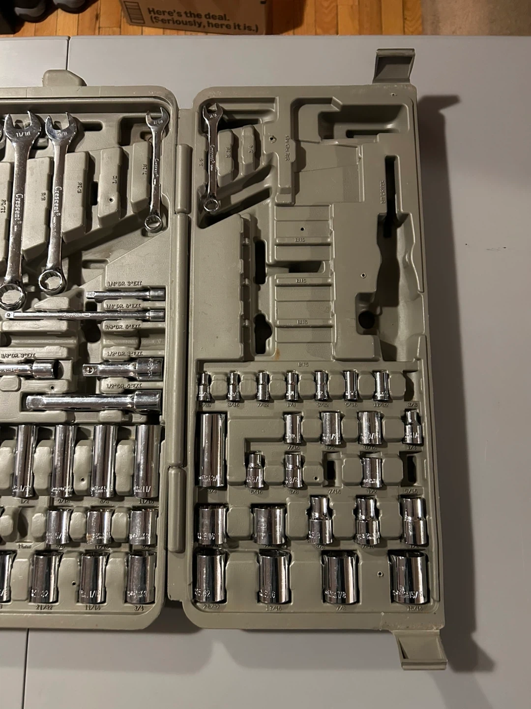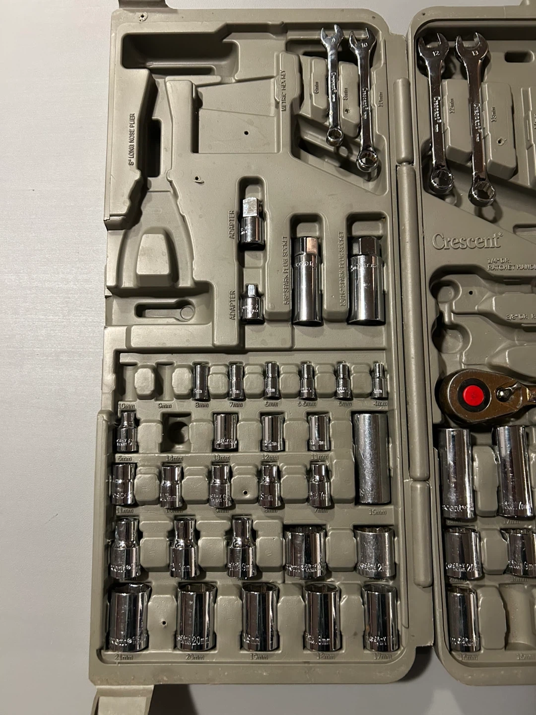This Crescent tool set is comprehensive, with a variety of sockets, wrenches, and accessories for a range of tasks. The set is in used condition, as shown in the images, but still has plenty of life and utility left. Some pieces missing, please examine photos closely to see.