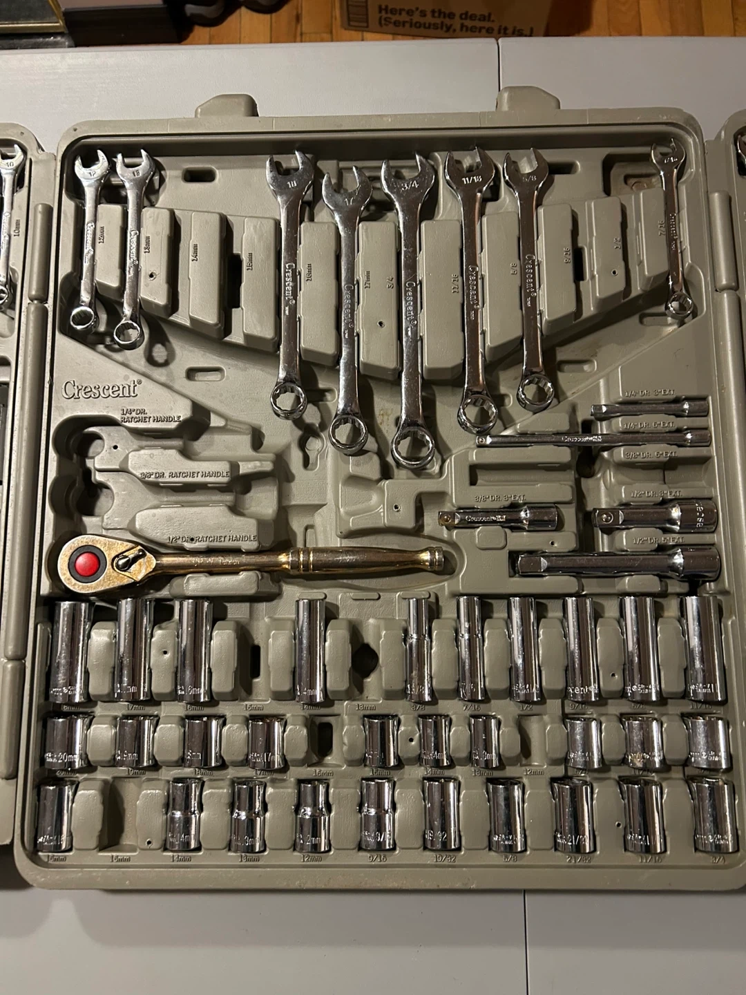 This Crescent tool set is comprehensive, with a variety of sockets, wrenches, and accessories for a range of tasks. The set is in used condition, as shown in the images, but still has plenty of life and utility left. Some pieces missing, please examine photos closely to see.