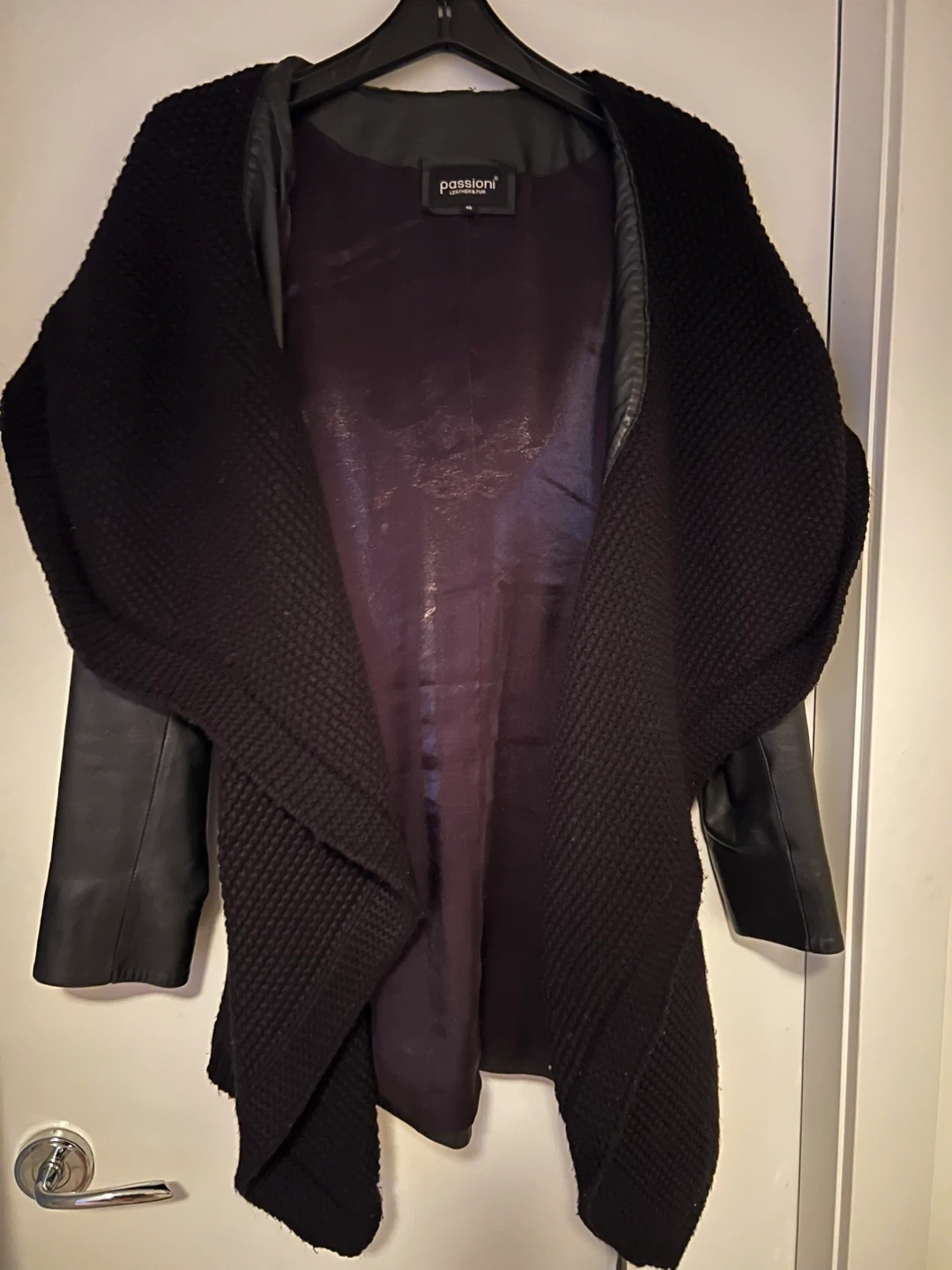 Selling a stylish black coat from Passioni Leather & Knitted trim with large hood. It's a size 40 and in good condition. Perfect for adding a touch of elegance to your wardrobe!