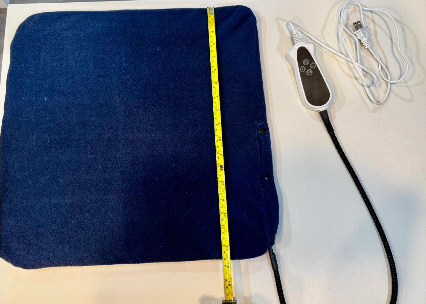 Cozy up with this blue heated pad! It measures approximately 17x17 inches, perfect for adding warmth and comfort on chilly days. It comes with a controller for adjusting the heat settings. Get ready to relax!