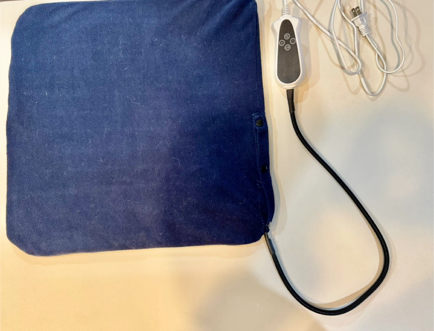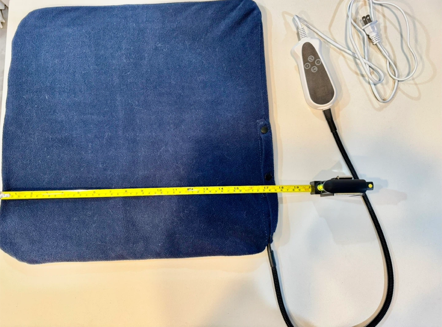 Cozy up with this blue heated pad! It measures approximately 17x17 inches, perfect for adding warmth and comfort on chilly days. It comes with a controller for adjusting the heat settings. Get ready to relax!