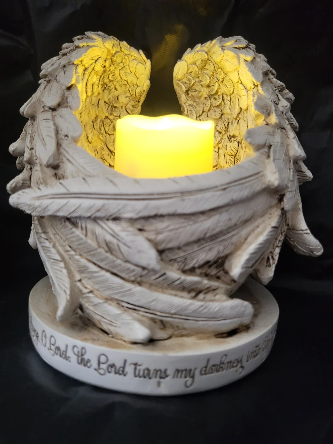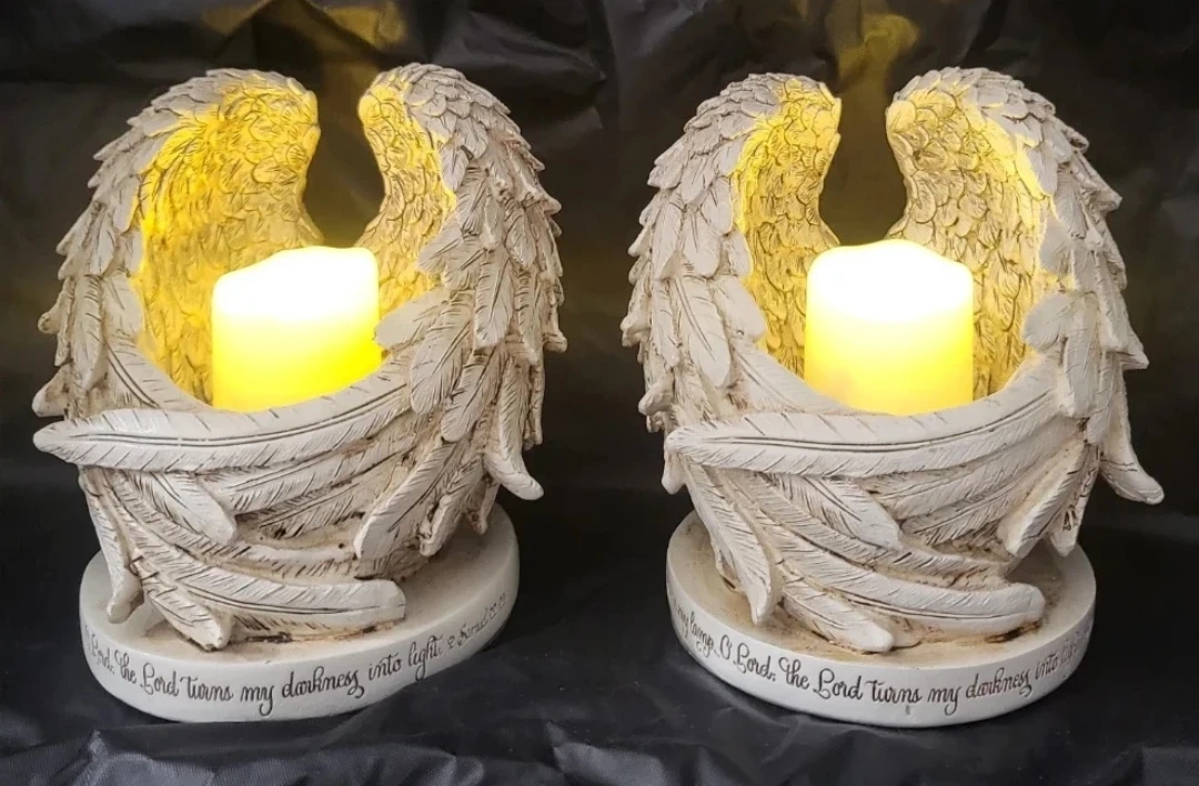 I'm selling this angel wings set candle holders. They are beautiful pieces that adds a touch of serenity to any space. The intricate feather detailing and soft glow create a calming ambiance. Perfect for displaying candles or small trinkets.