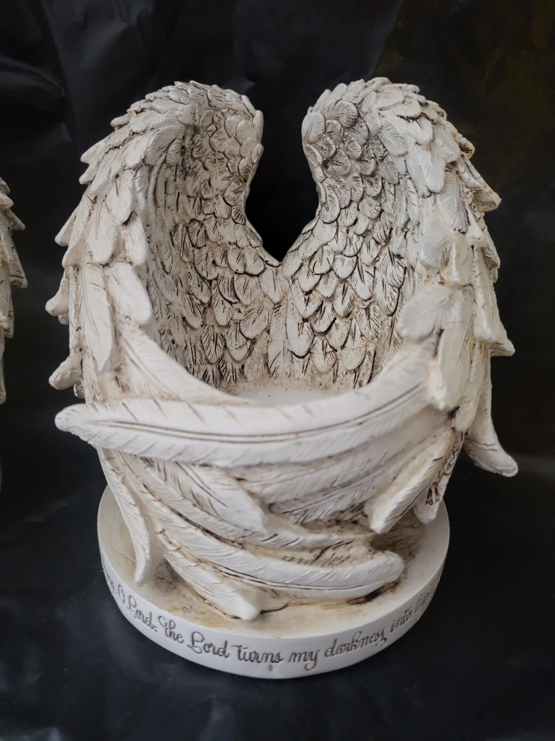 I'm selling this angel wings set candle holders. They are beautiful pieces that adds a touch of serenity to any space. The intricate feather detailing and soft glow create a calming ambiance. Perfect for displaying candles or small trinkets.
