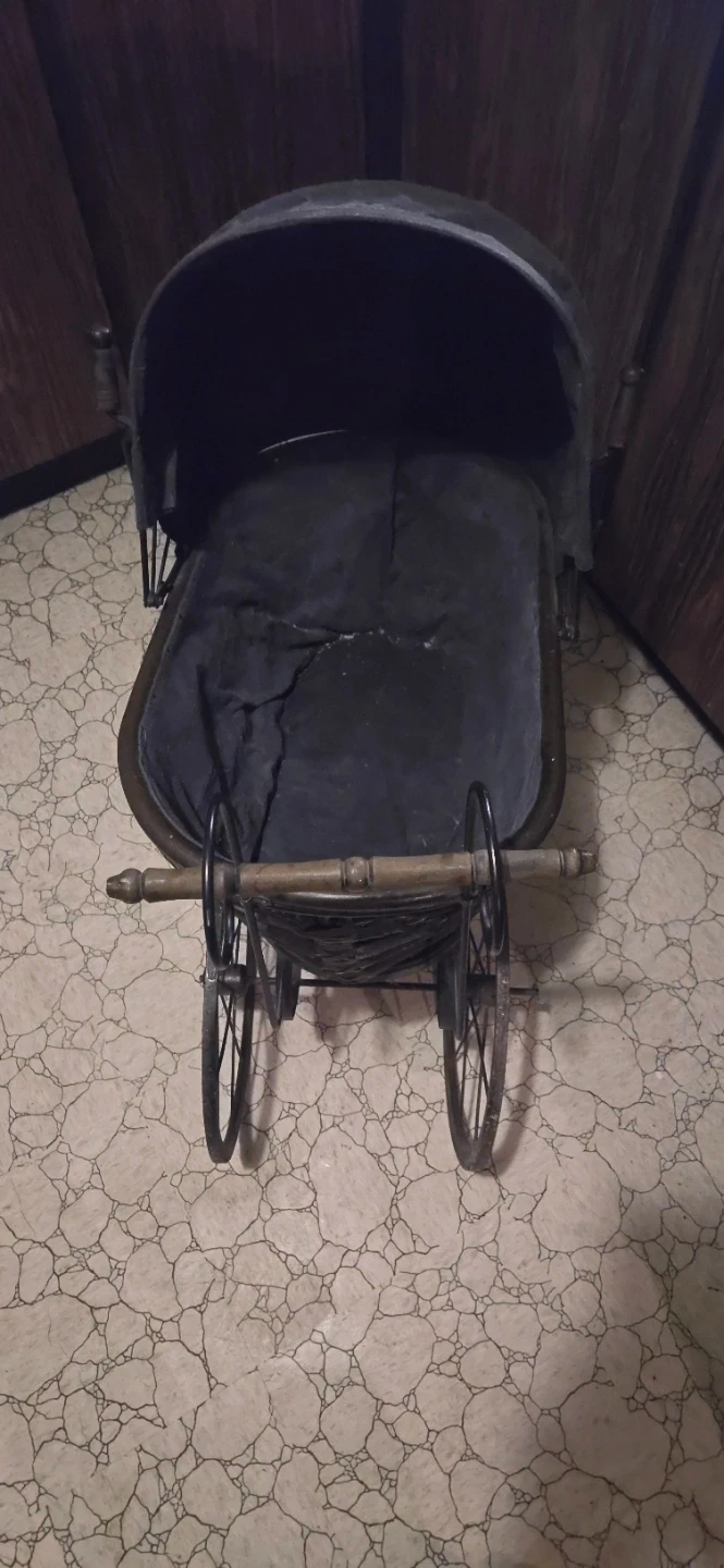 Selling an antique-style baby carriage. It's a unique piece that could be used as a decorative item or for display. The carriage has a vintage look with spoked wheels and a fabric cover. It shows some signs of wear consistent with its age, but it still has a lot of charm!