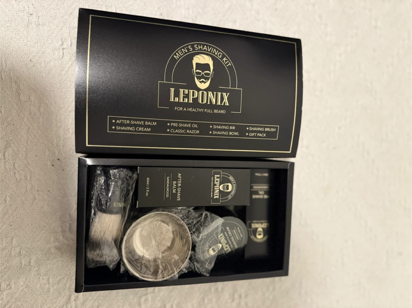 Selling a Leponix Men's Shaving Kit, perfect for a healthy full beard! The kit includes after shave balm, shaving cream, pre-shave oil, a classic razor, shaving bib, shaving bowl, shaving brush, and a gift pack. Everything you need for a great shave is right here