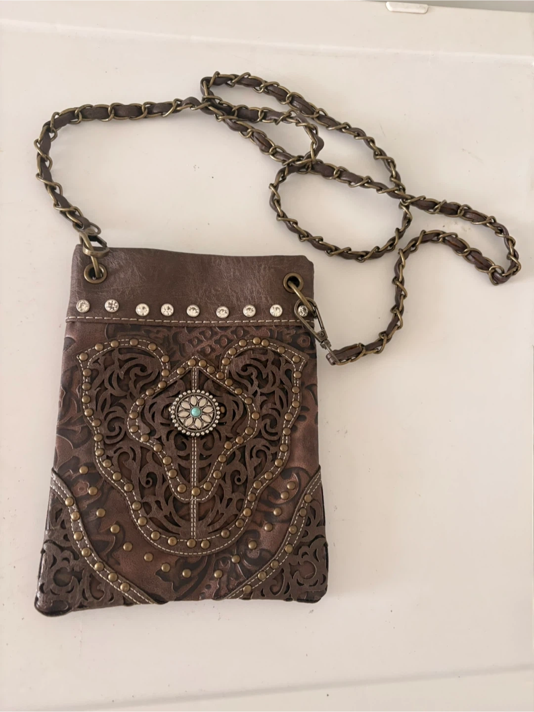 Selling a stylish brown leather crossbody bag! It features a unique, decorative design with a chain strap. The bag is in good condition and perfect for carrying your essentials while adding a touch of flair to your outfit
