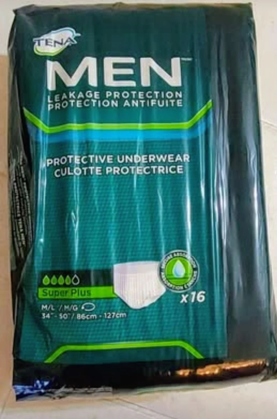 Selling a pack of Tena Men Leakage Protection Protective Underwear. This is the Super Plus absorbency level, and the size is M/L (34"-50" / 86cm-127cm). It comes with 16 pairs of underwear in the package