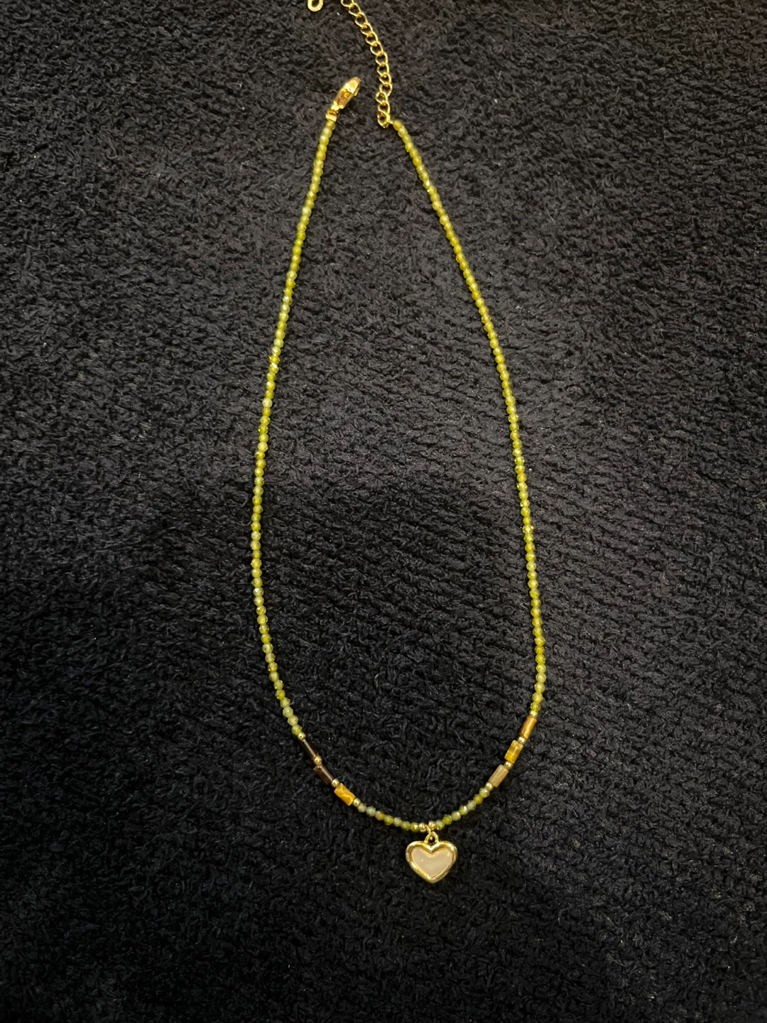This is a cute beaded necklace with a heart pendant. It features green and gold beads with a gold chain. It's in great condition!