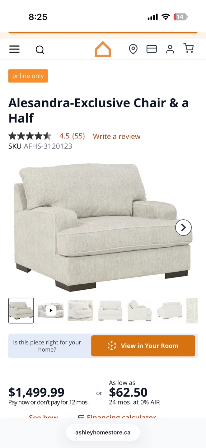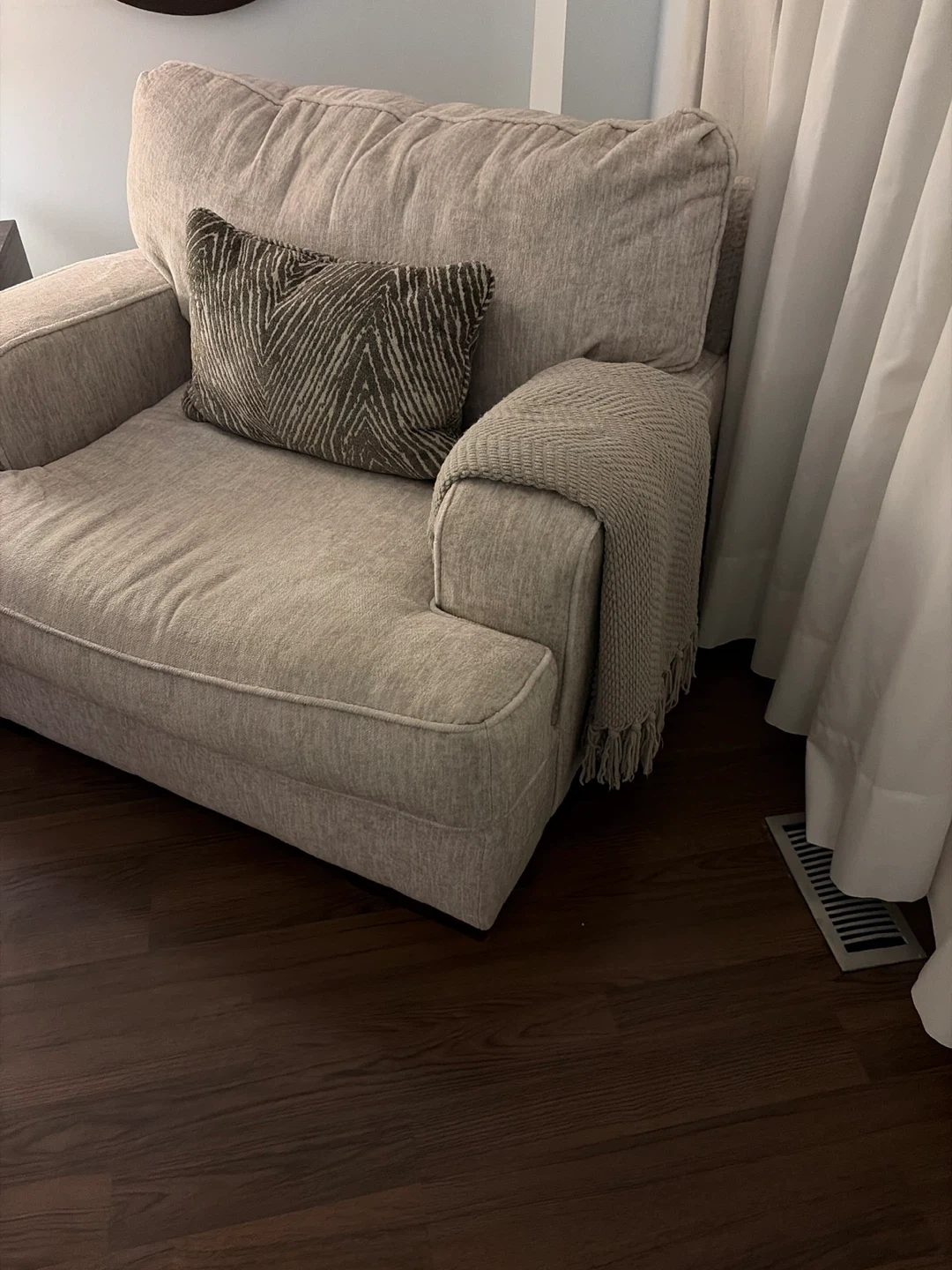 Cozy beige armchair perfect for any living space! The chair is in great condition and ready to add some comfort to your home. It is barely been used or sat on. Bought three years ago but not in use much so selling it to save some space. Its original price is $1499 on ashley’s website.