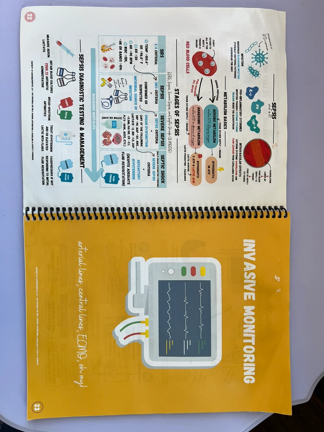 It is a visual guide to critical care nursing that includes information on topics such as sepsis, invasive monitoring, and vasopressors & inotropic agents