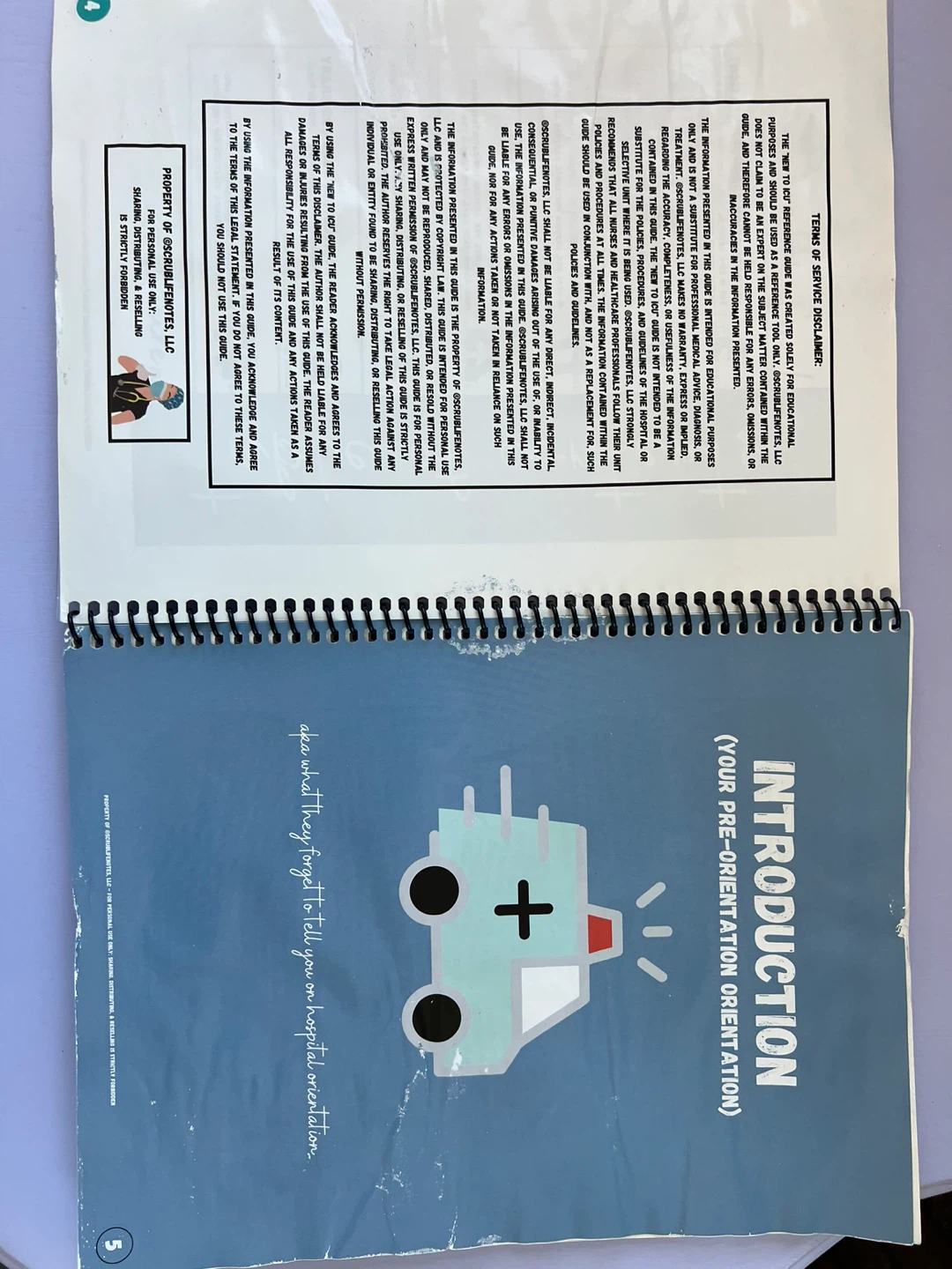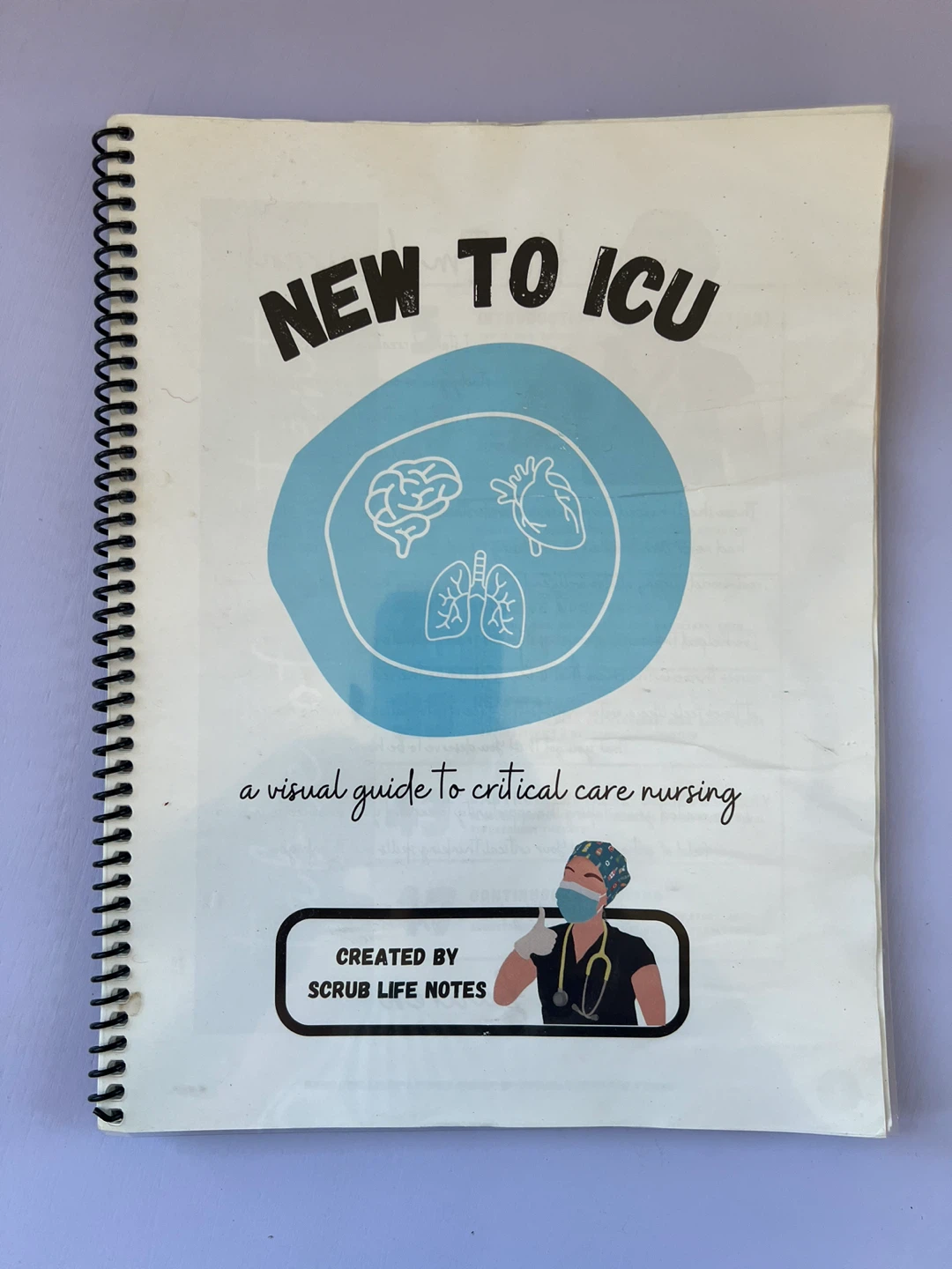I'm selling a spiral-bound book titled "New to ICU: A Visual Guide to Critical Care Nursing" created by Scrub Life Notes