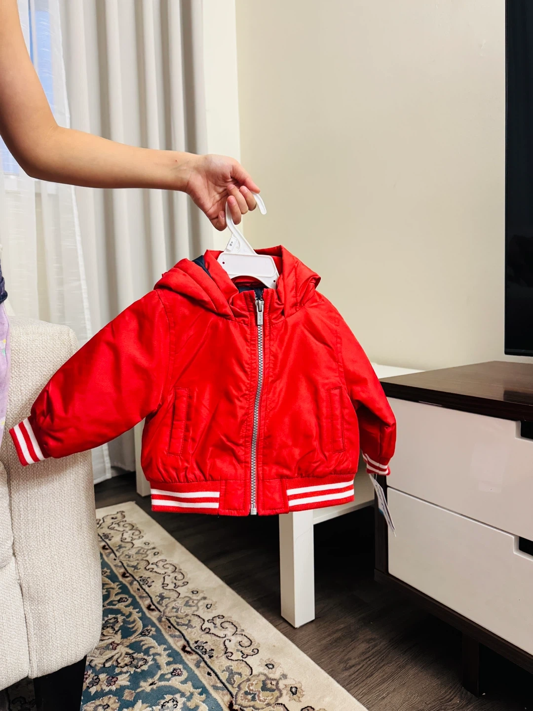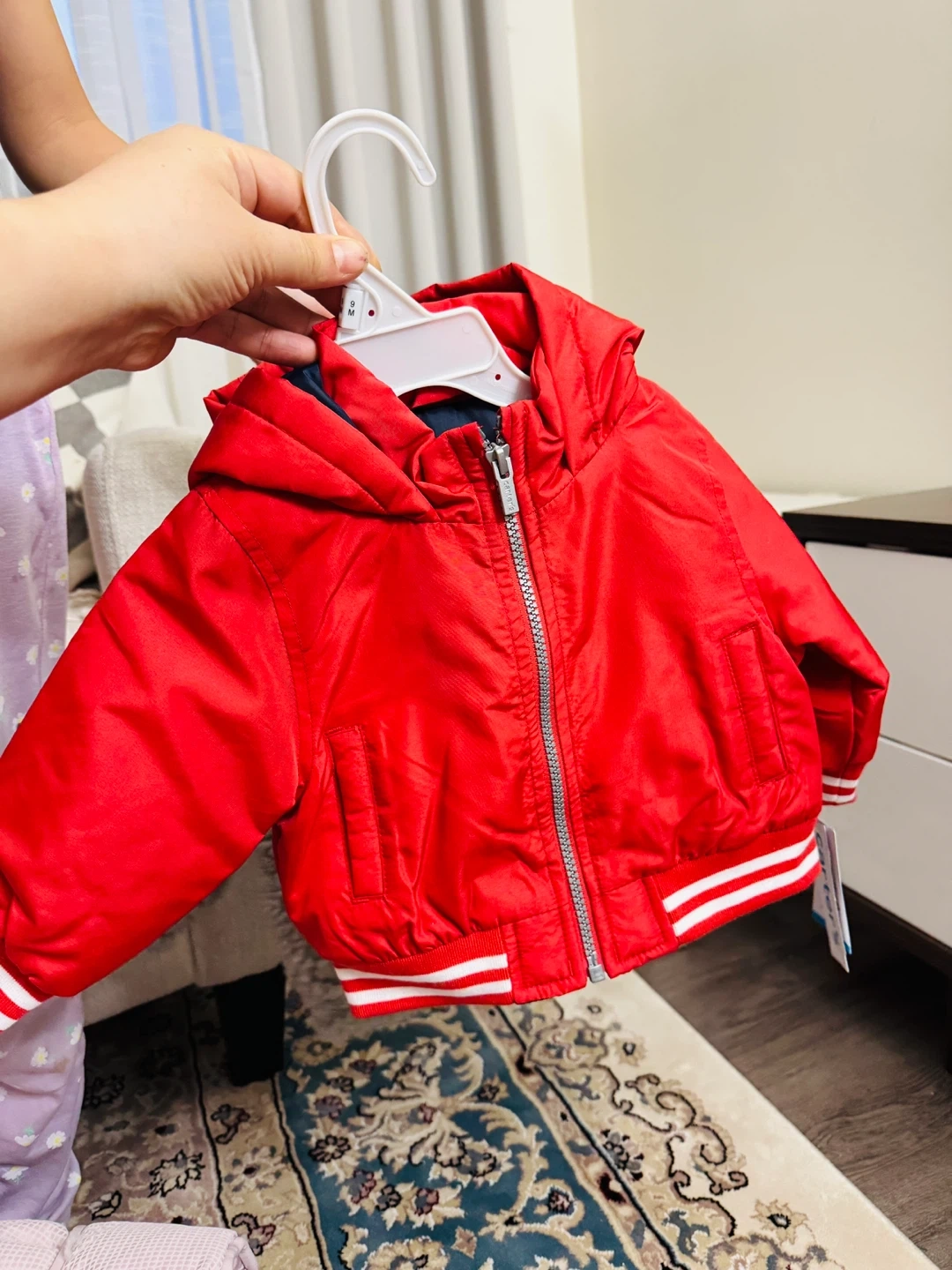 This adorable Tommy Hilfiger baby jacket is in great condition! It's a vibrant red colour and perfect for keeping your little one warm. The jacket features a hood and a zip-up front, making it easy to put on and take off. It's a stylish and practical addition to any baby's wardrobe
