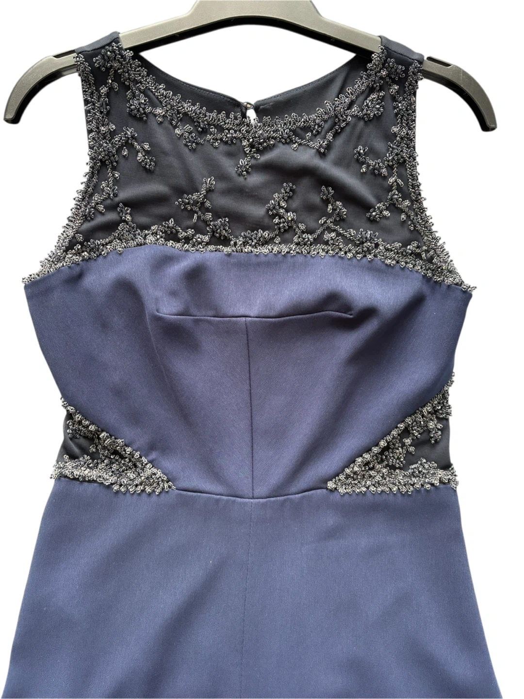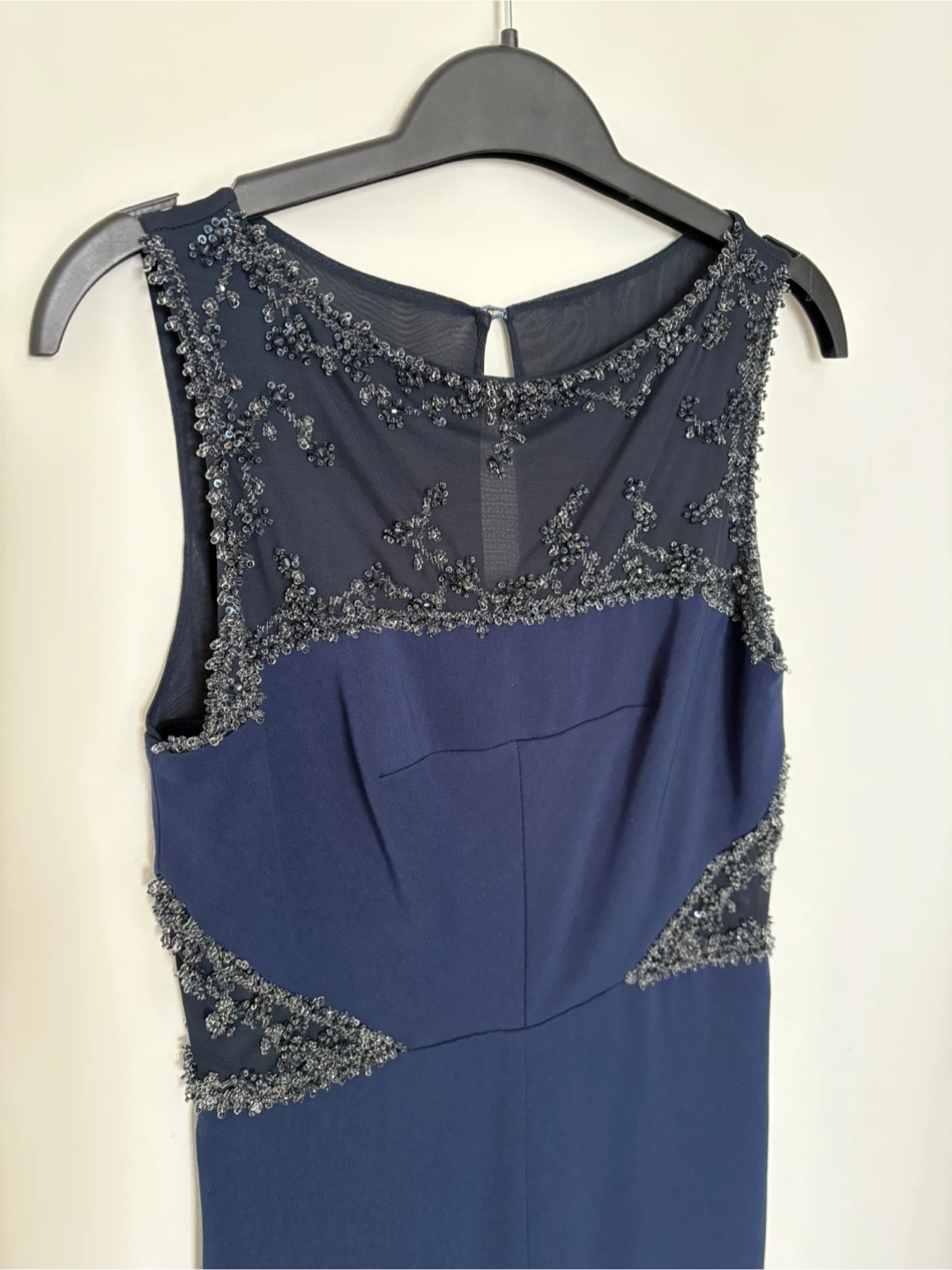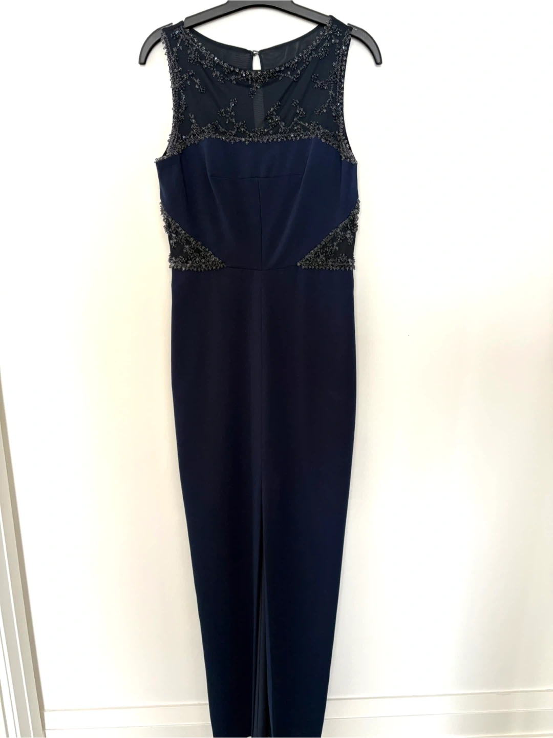 Stunning Badgley Mischka floor-length evening gown in a deep navy blue. This elegant, figure-skimming silhouette features intricate beadwork along the illusion neckline, bodice, and waist for a refined, sculpting effect. A subtle sheer upper panel adds sophistication, while the front center slit provides graceful movement and a touch of allure.