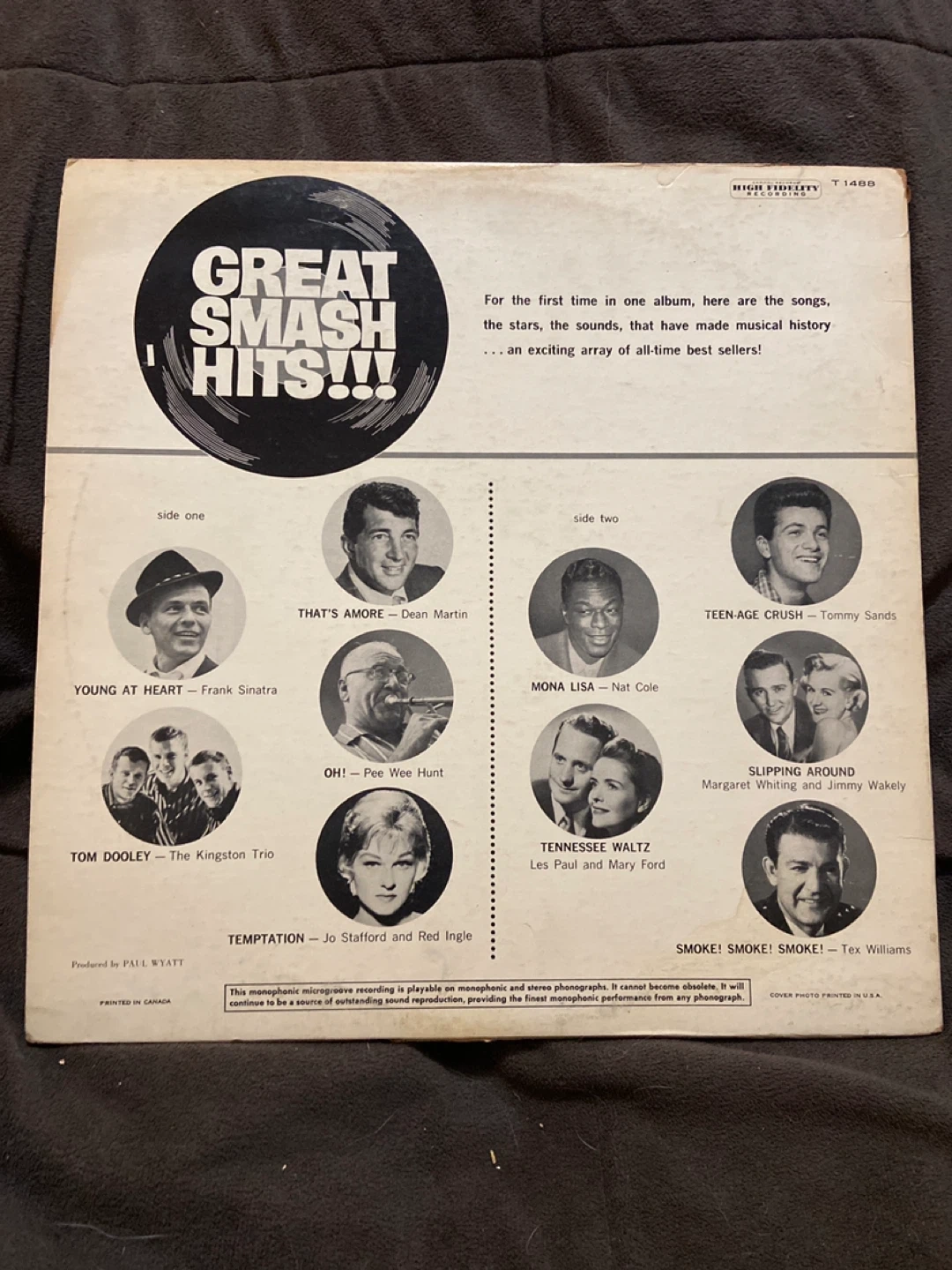 Selling a collection of vinyl records, including "Great Smash Hits!!!" featuring artists like Frank Sinatra, Dean Martin, Nat Cole, and Tommy Sands, and "Movin' With Nancy." Perfect for any vinyl collector!