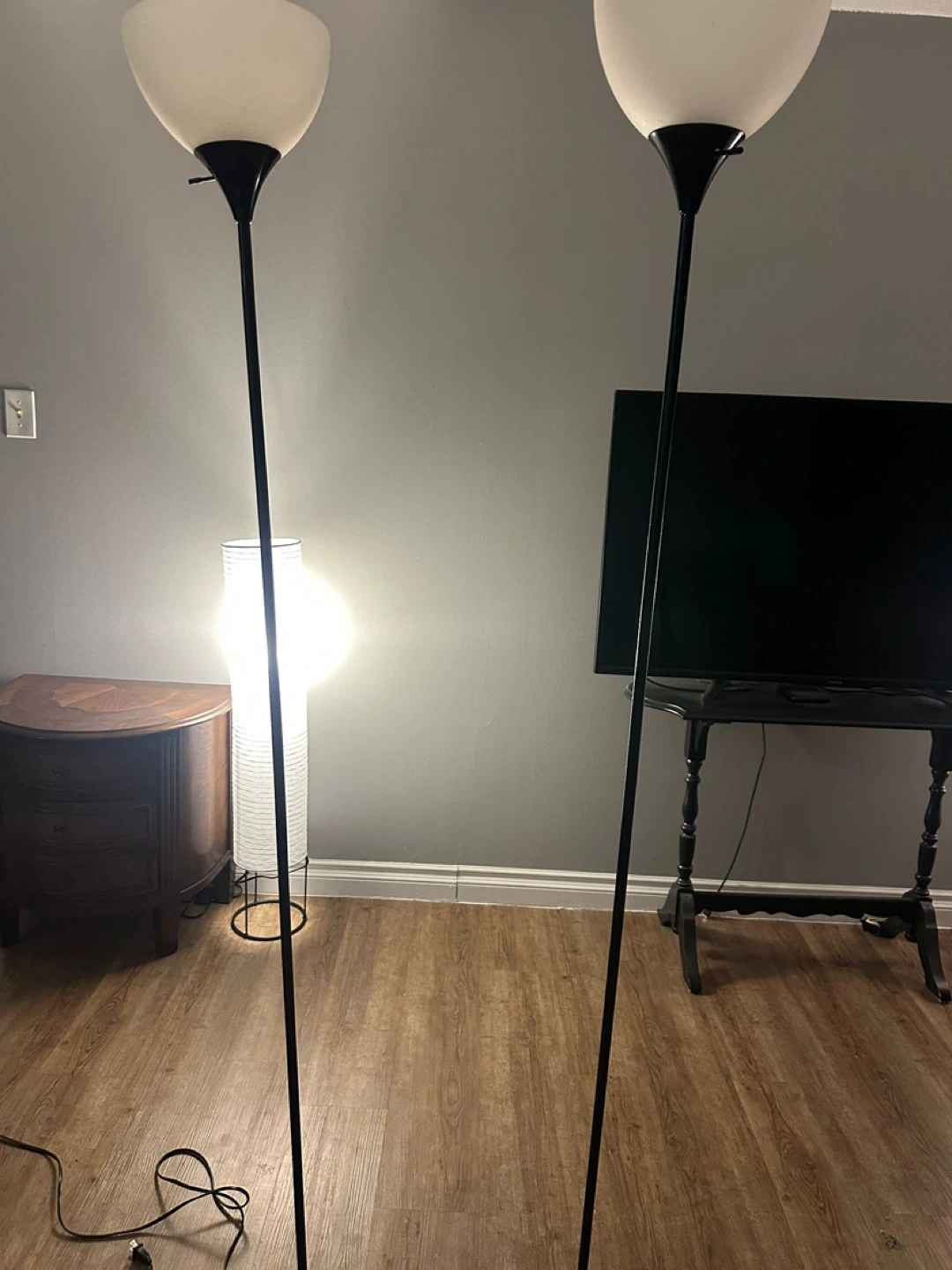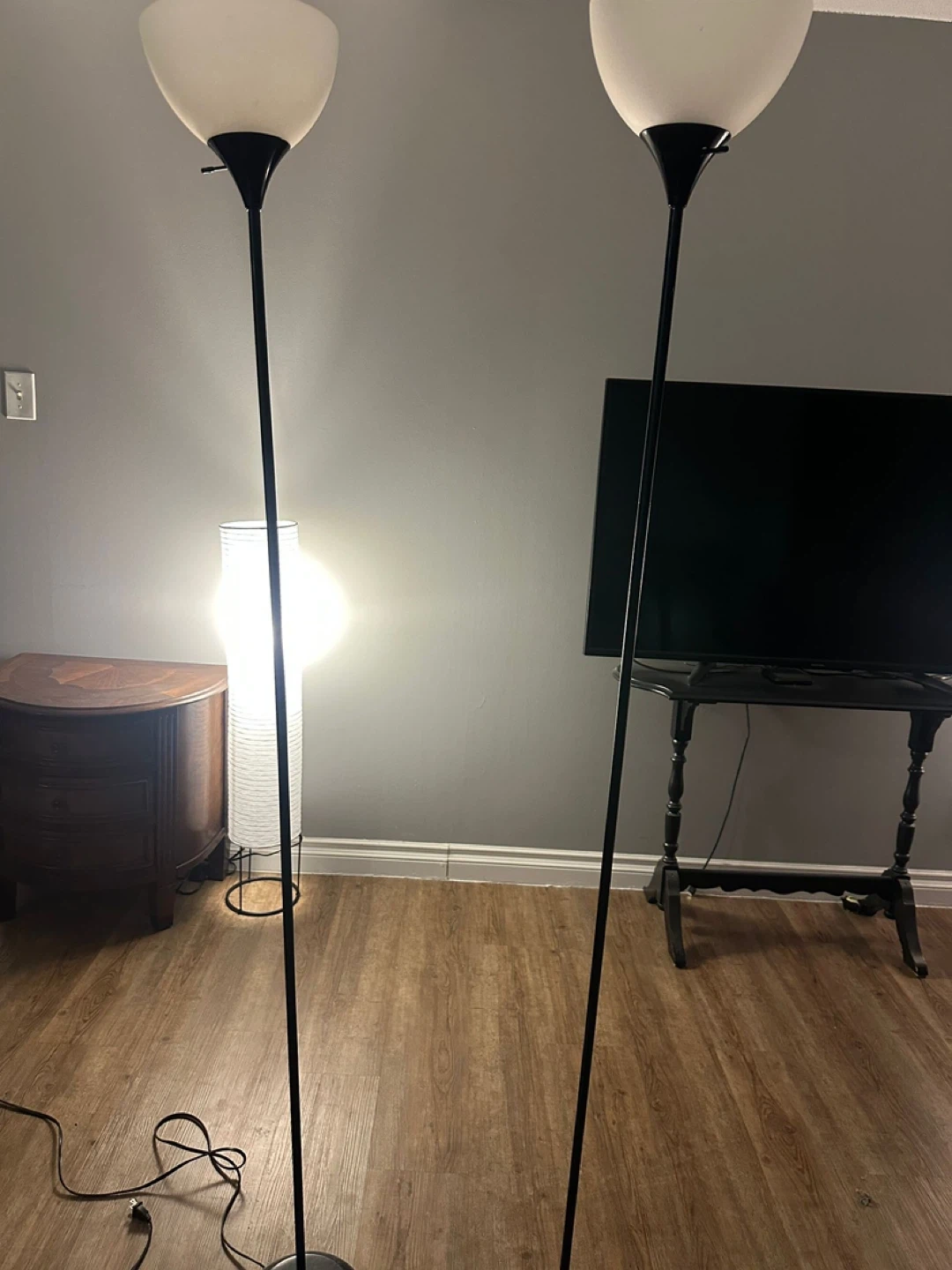 Selling a set of two floor lamps! They're in great condition and would look lovely in any room. They have a simple, modern design with a black stand and a white, tulip-shaped shade. Perfect for adding some extra light to your living space!