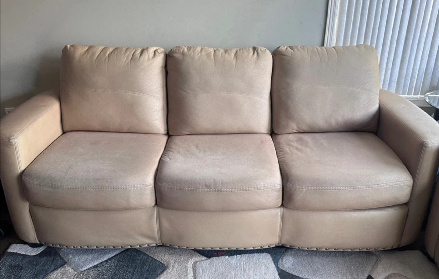 Selling a beige leather sofa that comfortably seats three people. It's in good condition and would be a great addition to any living room or den. Got lots of life left.