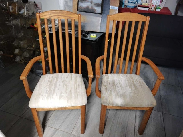A set of two used chairs, perfect for adding a touch of classic charm to your dining area or living space; these chairs feature a sturdy wooden frame and a comfortable upholstered seat. These chairs are in fair condition. Good sturdy chairs. If the ad is still up, the chairs are still available!