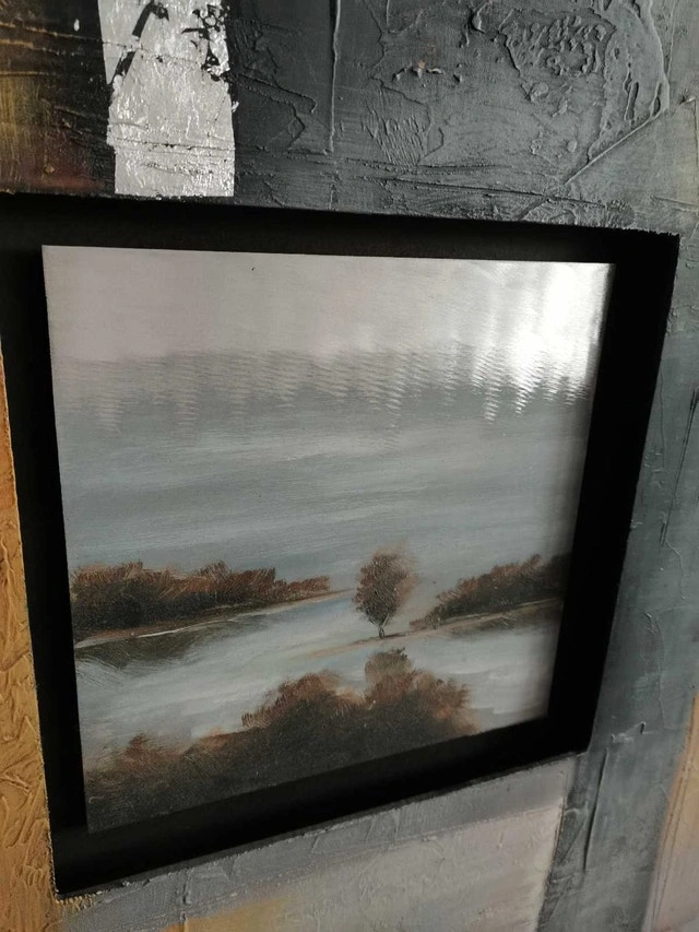 Art work painting, with a decorative textured frame. It has a peaceful scene of a lake with trees. It could add a touch of serenity to any room. If the ad is still up, it's still available.
