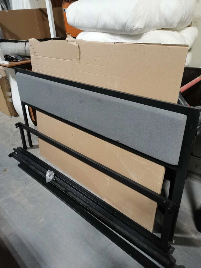 This queen-sized bed frame features a sleek, modern design with a grey upholstered headboard and a sturdy black metal frame. It is in used condition, but very good. The frame is easy to assemble and provides excellent support for your mattress. All hardware is included.