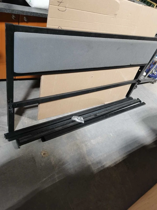 This queen-sized bed frame features a sleek, modern design with a grey upholstered headboard and a sturdy black metal frame. It is in used condition, but very good. The frame is easy to assemble and provides excellent support for your mattress. All hardware is included.