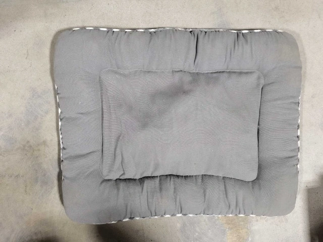 This comfy dog bed is ready for a new furry friend! It's in used condition, but has plenty of life left. The neutral grey checkered pattern will fit in with any home decor. Your pup will love snuggling up on this soft and supportive bed. Looking for a cozy spot for your canine companion? Look no further!