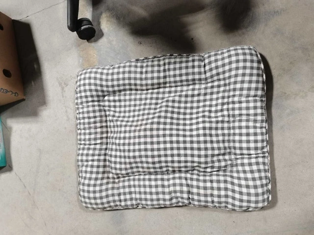 This comfy dog bed is ready for a new furry friend! It's in used condition, but has plenty of life left. The neutral grey checkered pattern will fit in with any home decor. Your pup will love snuggling up on this soft and supportive bed. Looking for a cozy spot for your canine companion? Look no further!