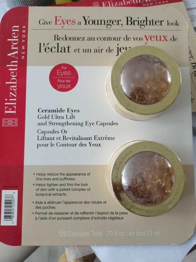 I am selling Elizabeth Arden Ceramide Eyes Gold Ultra Lift and Strengthening Eye Capsules. These capsules help reduce the appearance of fine lines and puffiness, while also tightening and firming the look of skin with a potent complex of botanical extracts. This is a new pack of 120 capsules, totaling 0.70 fl oz/21 ml.