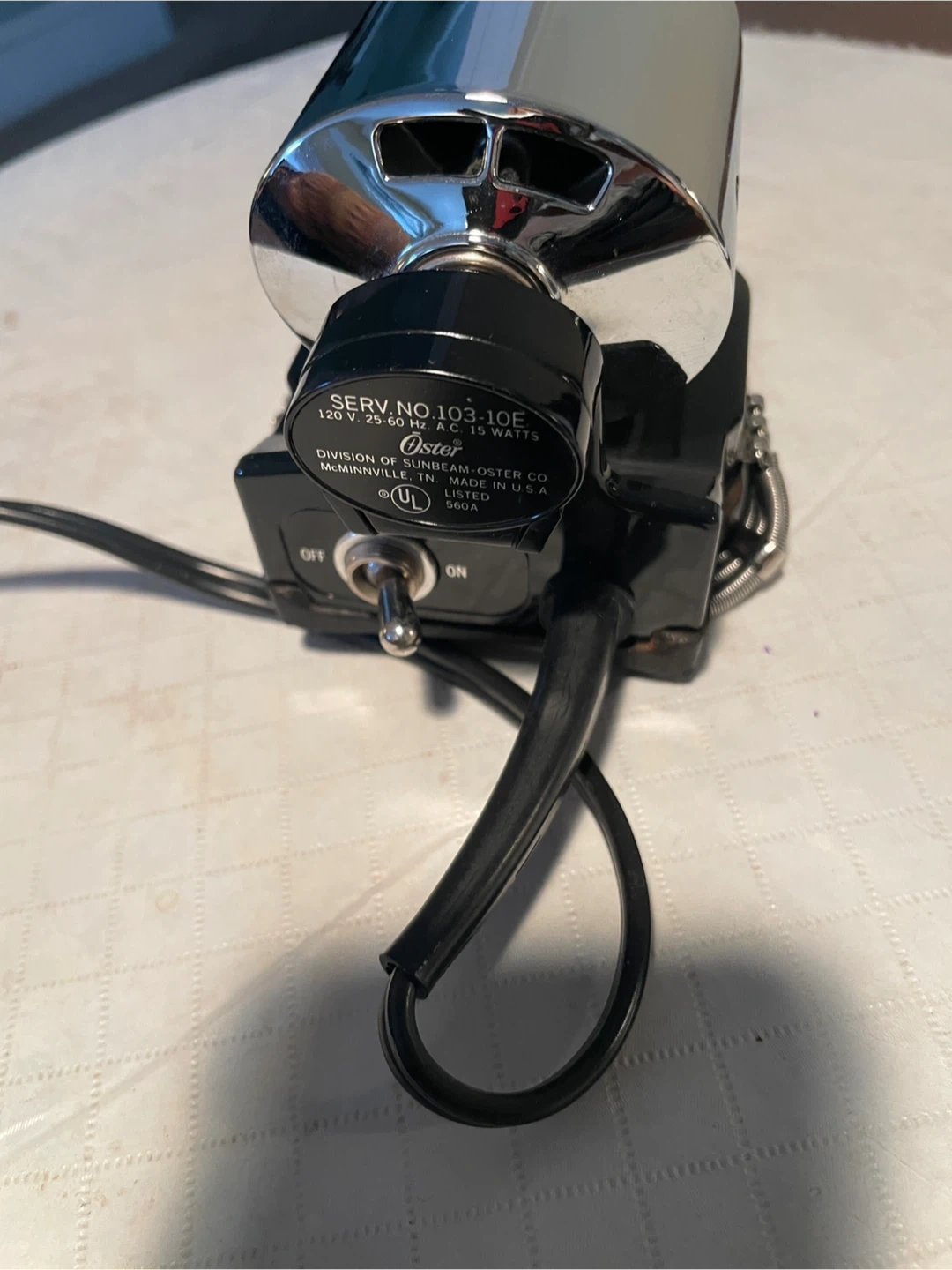 Selling an Oster Professional Massager. It's model number 103-10E and operates at 120 V 25-60 Hz at 15 watts. Made in the USA