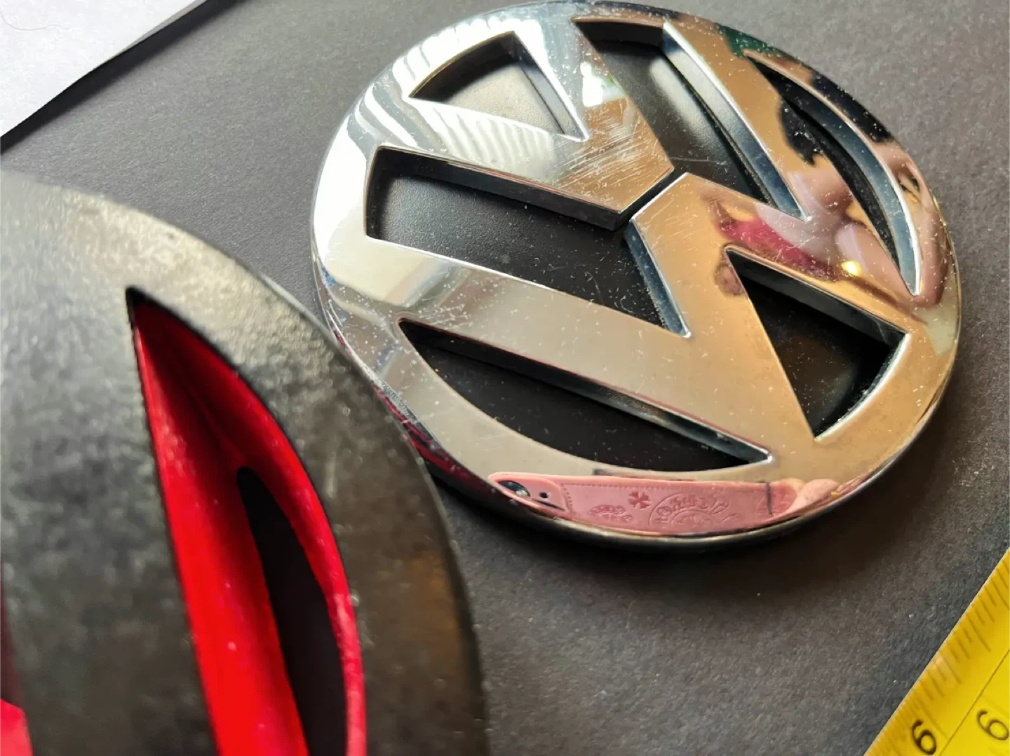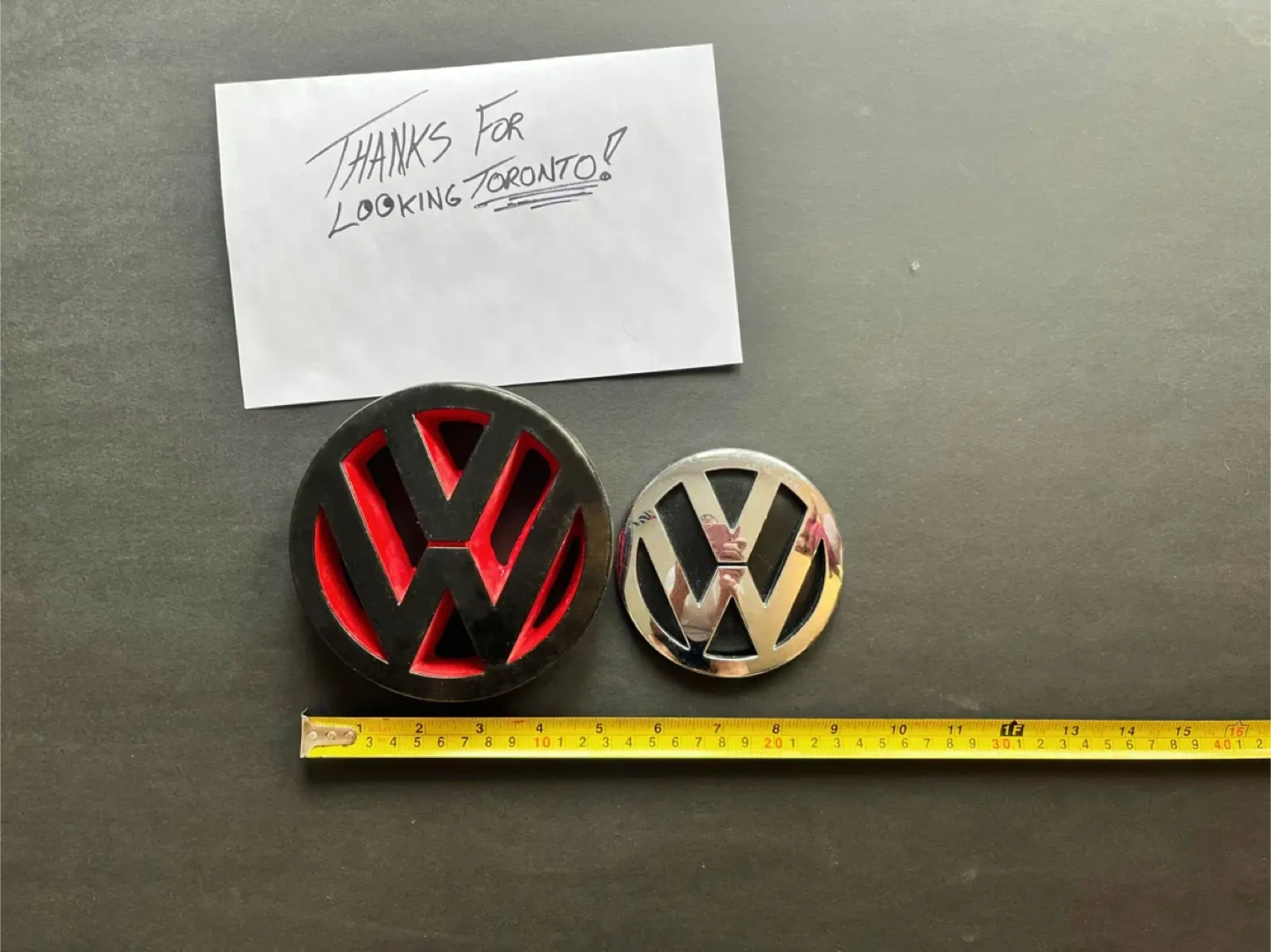 Selling two authentic Volkswagen logos/emblems in different sizes. Details: • Large VW logo – approx. 15 cm (6") – Custom painted black with red background – Good overall condition • Smaller VW logo – approx. 9.5 cm (3.75") – OEM chrome, unmodified – Good condition with normal wear Important Notes: Custom painted logo is sold as-is Installation/affixing is up to the buyer No mounting hardware included Common ways buyers install/affix emblems: Automotive 3M double-sided emblem tape Automotive-grade silicone adhesive Badge adhesive or epoxy (permanent install) Please verify size and fitment for your specific VW model. Pick up in person. TEXT MESSAGE me if interested as I do not check messages here often!