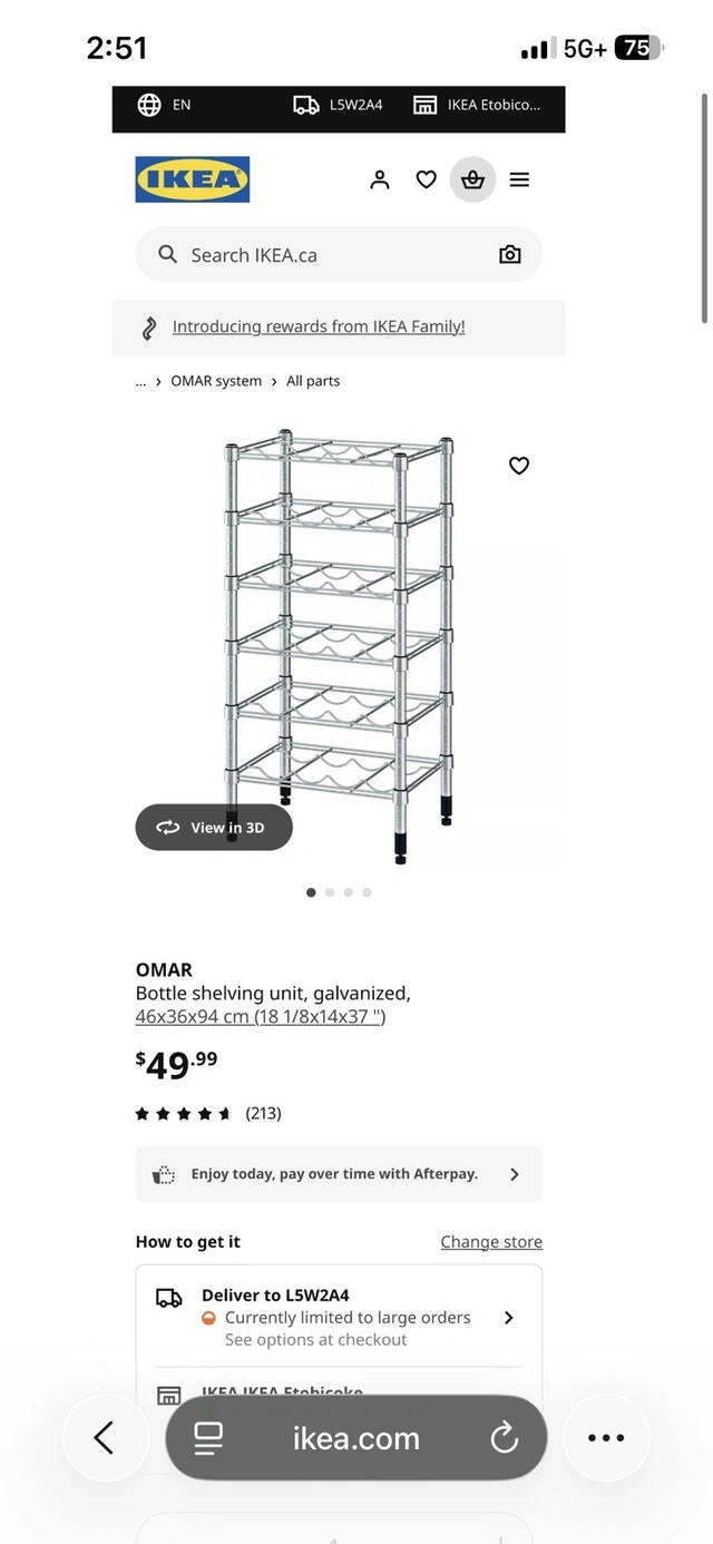 2 racks $35 each in box This OMAR Bottle shelving unit, galvanized, with dimensions of 46x36x94 cm (18 1/8x14x37 "), is perfect for adding functional storage with an industrial vibe to your space. This used unit is in good condition and ready to organize your bottles or other items efficiently. Here are some details about this shelving unit: * Dimensions: 46x36x94 cm (18 1/8x14x37 ") * Material: Galvanized steel * Adjustable feet for stability The median price for similar shelving units is about $35 CAD, so I've priced it fairly. If you're seeing this ad, the shelf is still available! Don't miss out on this fantastic storage solution!