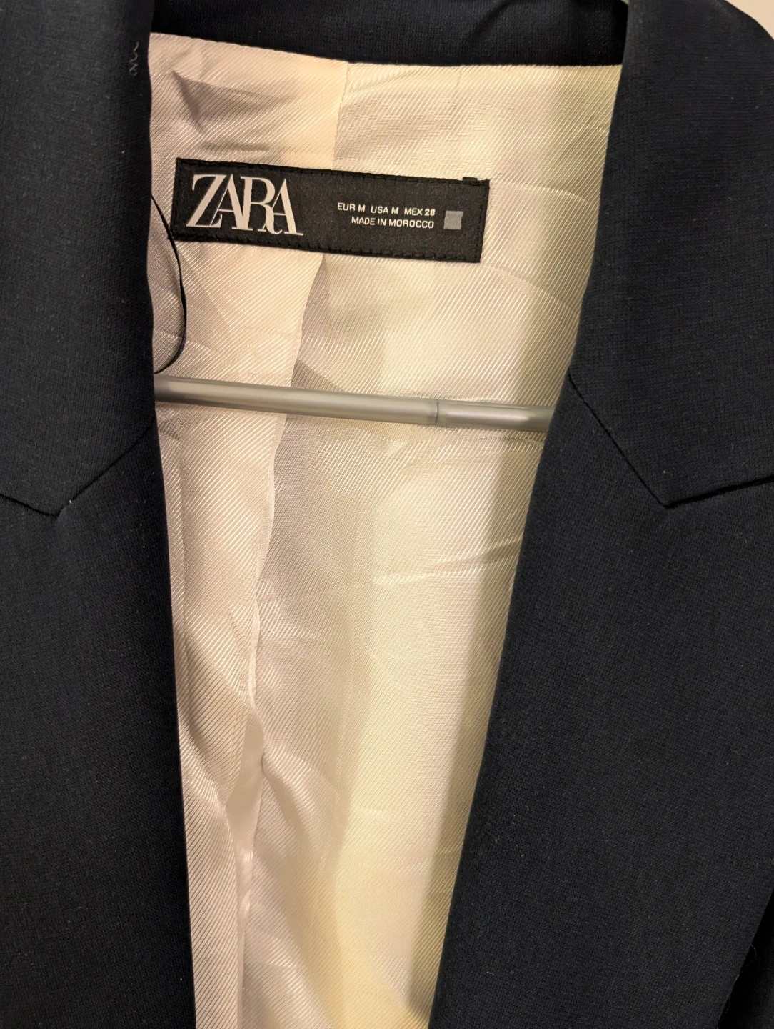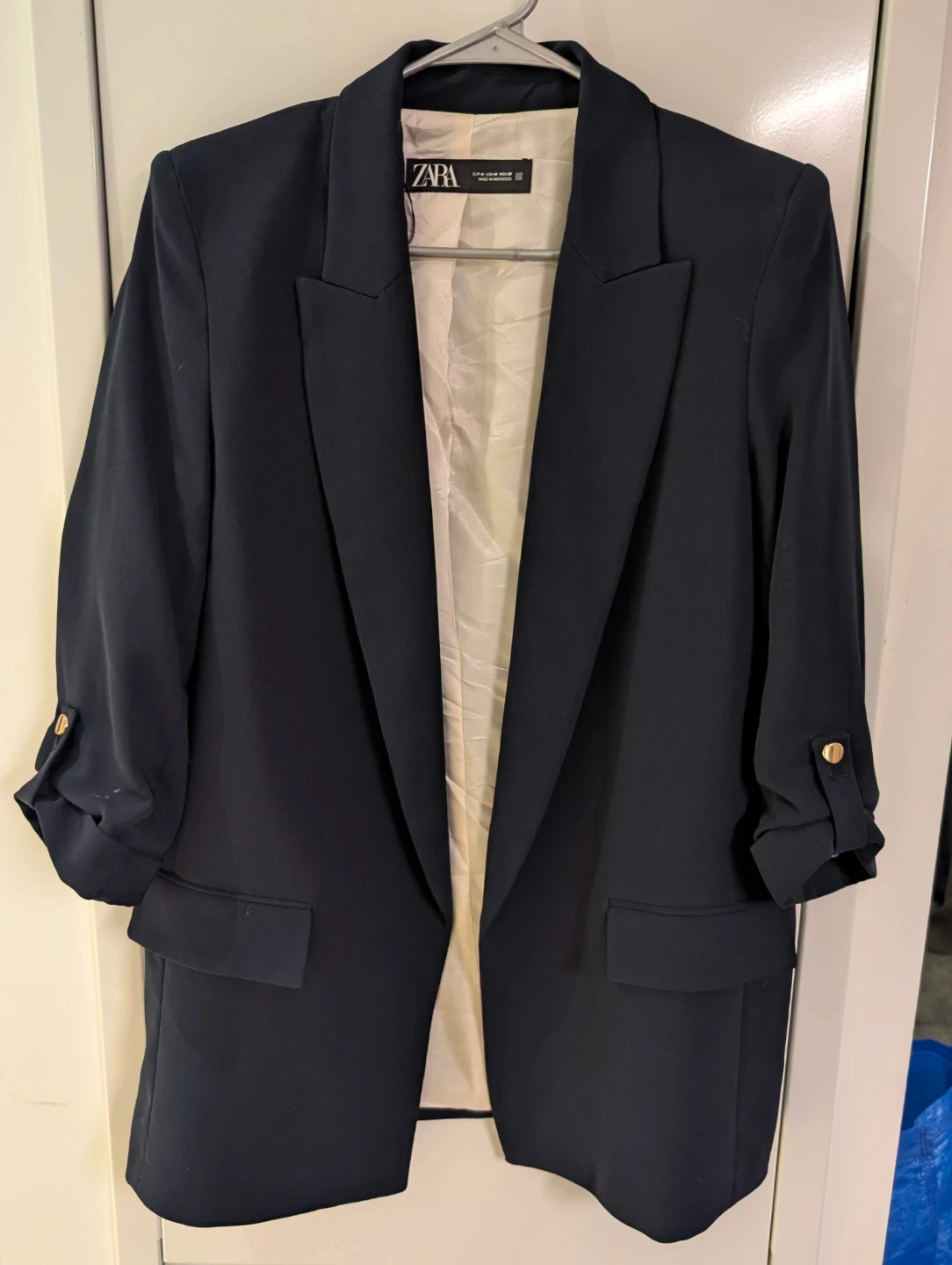 Selling a Zara navy blue blazer in size M. It's in great condition and has a stylish, versatile look. Perfect for dressing up or down!