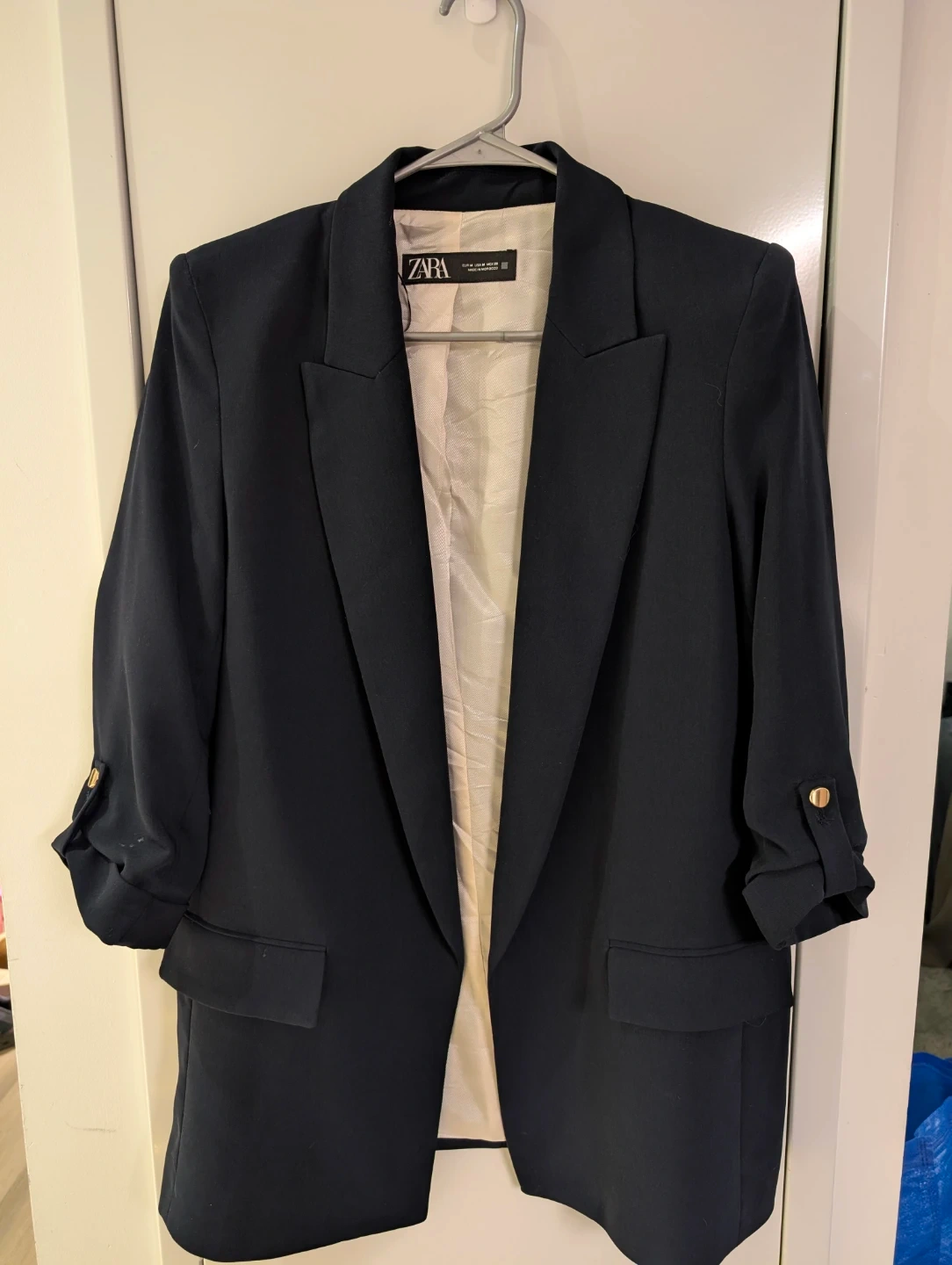 Selling a Zara navy blue blazer in size M. It's in great condition and has a stylish, versatile look. Perfect for dressing up or down!