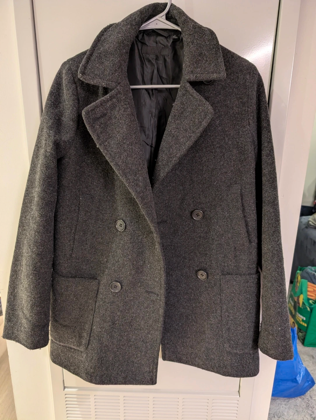 Selling a stylish wool blend pea coat from Uniqlo! It's a size small and in great condition. This coat is perfect for cooler weather and has a classic, versatile look. It would be a great addition to any wardrobe!