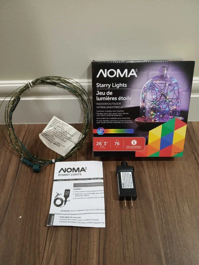 The NOMA Starry LED Lights offer a fun and festive way to turn your home into a winter wonderland this holiday season. Flexible ultra-slim green wire conforms to any shape. Plugs at both ends. Connect up to 8 sets to one outlet. LED uses up to 90% less energy vs incandescent bulbs. Total Wattage: 6W Volt: 120 V Colour: Multicolour with Green Wire. NOTE: Intended for seasonal use and not for permanent installation, fully dry out lights before storing in a cool, dry location protected from sunlight when not in use. Comes with original packaging box.