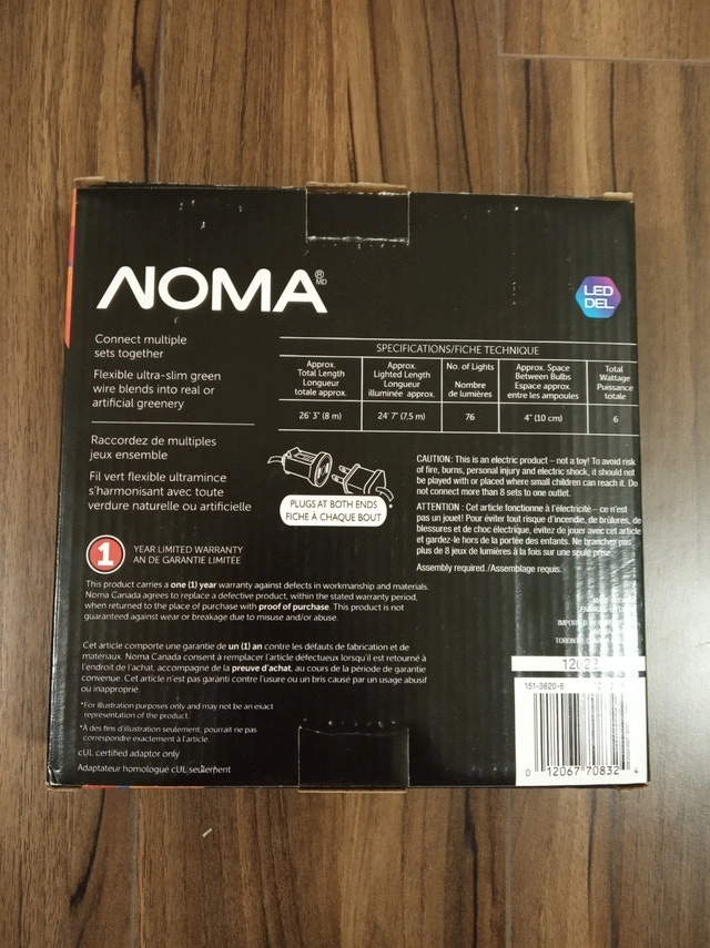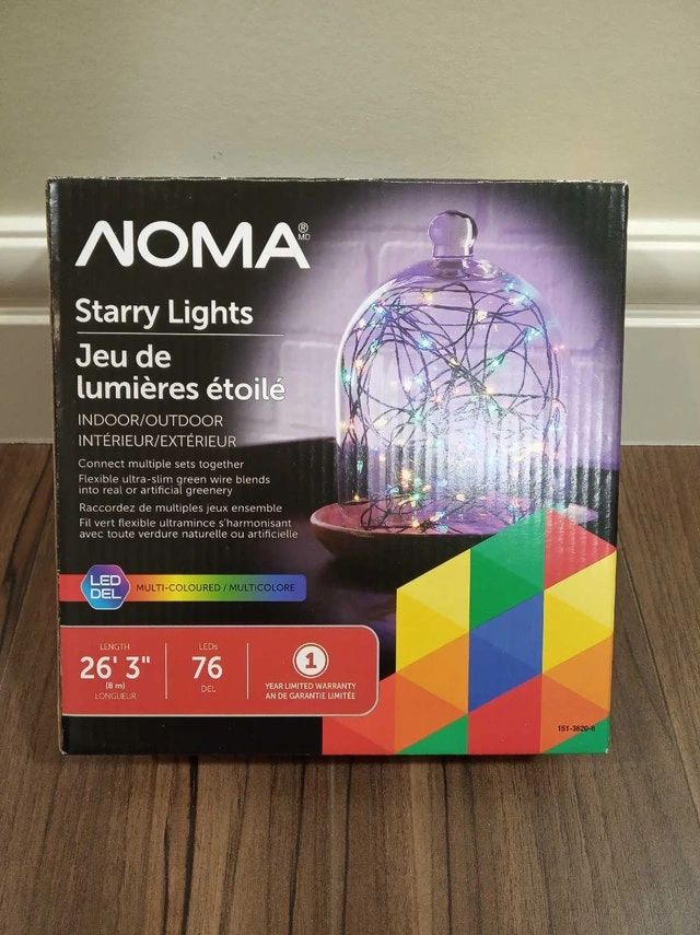 The NOMA Starry LED Lights offer a fun and festive way to turn your home into a winter wonderland this holiday season. Flexible ultra-slim green wire conforms to any shape. Plugs at both ends. Connect up to 8 sets to one outlet. LED uses up to 90% less energy vs incandescent bulbs. Total Wattage: 6W Volt: 120 V Colour: Multicolour with Green Wire. NOTE: Intended for seasonal use and not for permanent installation, fully dry out lights before storing in a cool, dry location protected from sunlight when not in use. Comes with original packaging box.