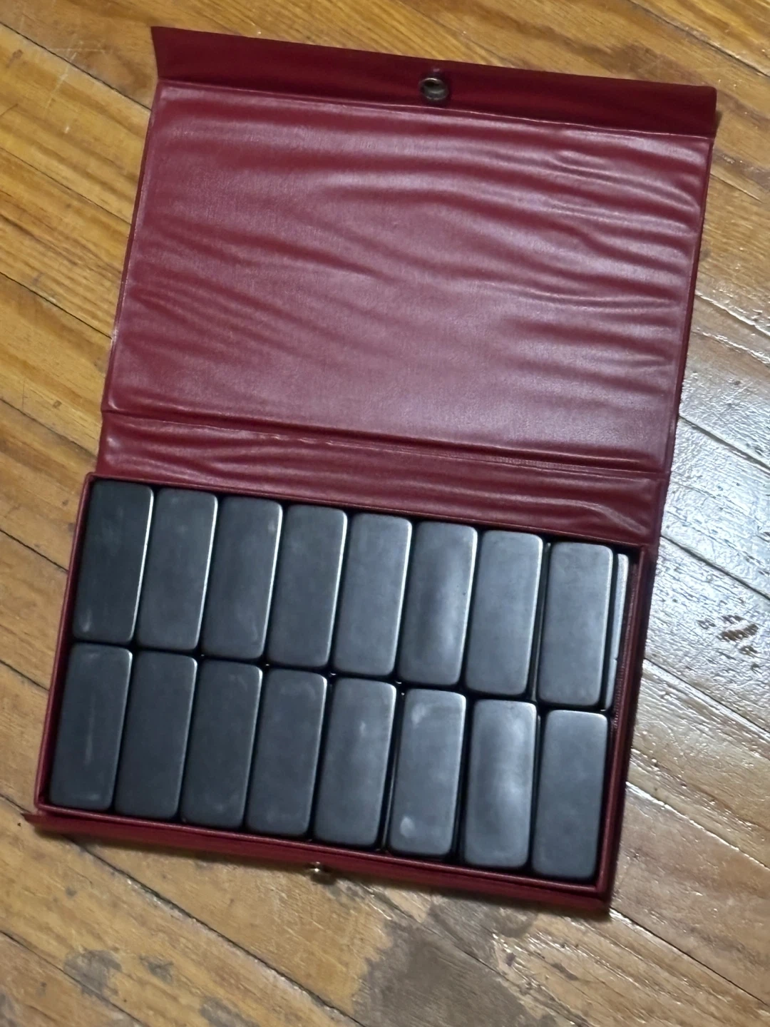 Classic Double Six domino set in great condition. These are solid, heavy-weighted black tiles with distinctive red and white pips, much more substantial than modern lightweight versions.
