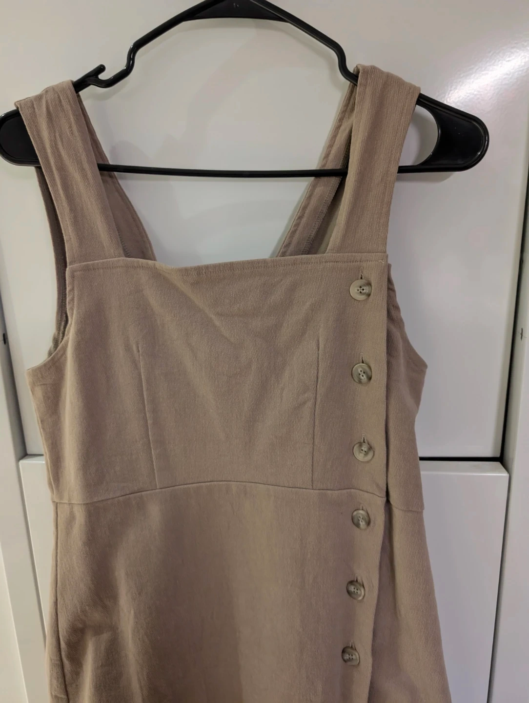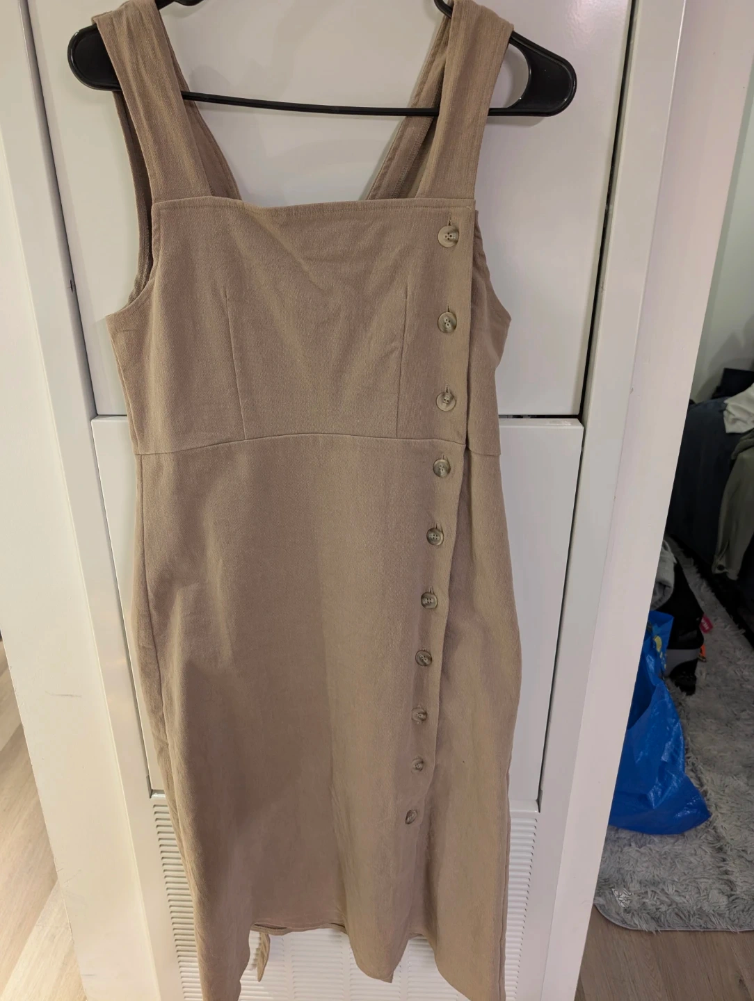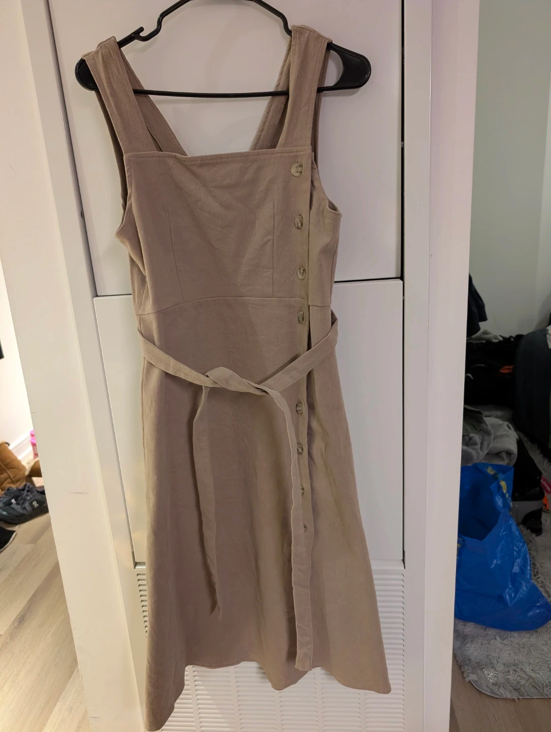 Here's a cute tan sleeveless dress! It features a belt and button details on the side. Perfect for a casual day out or dressing up for an evening event