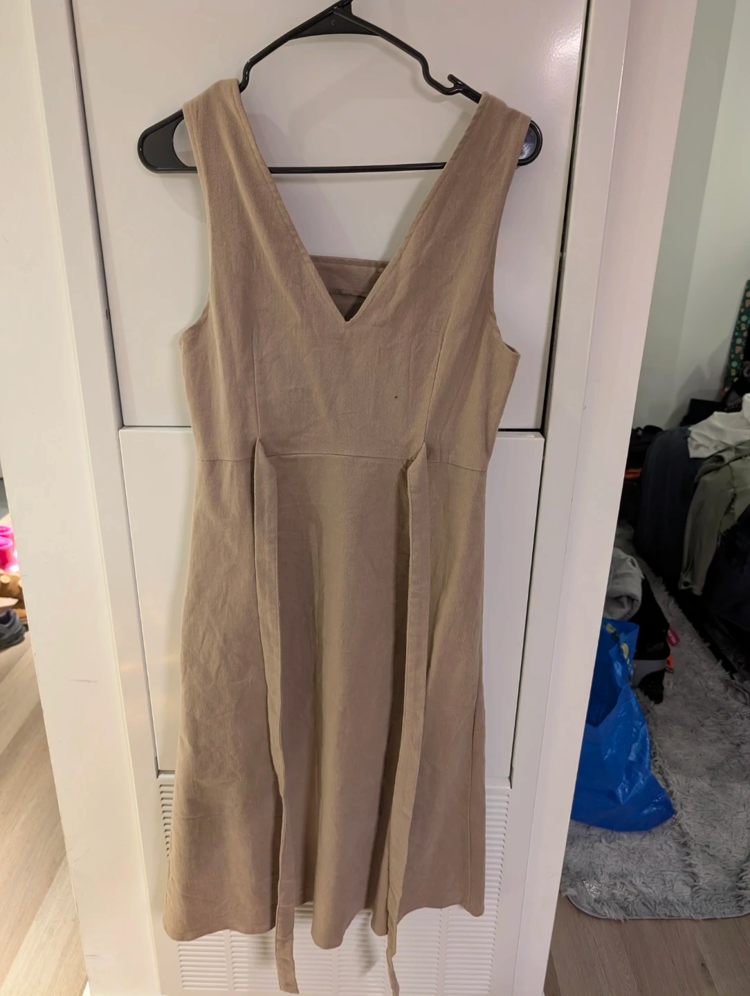 Here's a cute tan sleeveless dress! It features a belt and button details on the side. Perfect for a casual day out or dressing up for an evening event