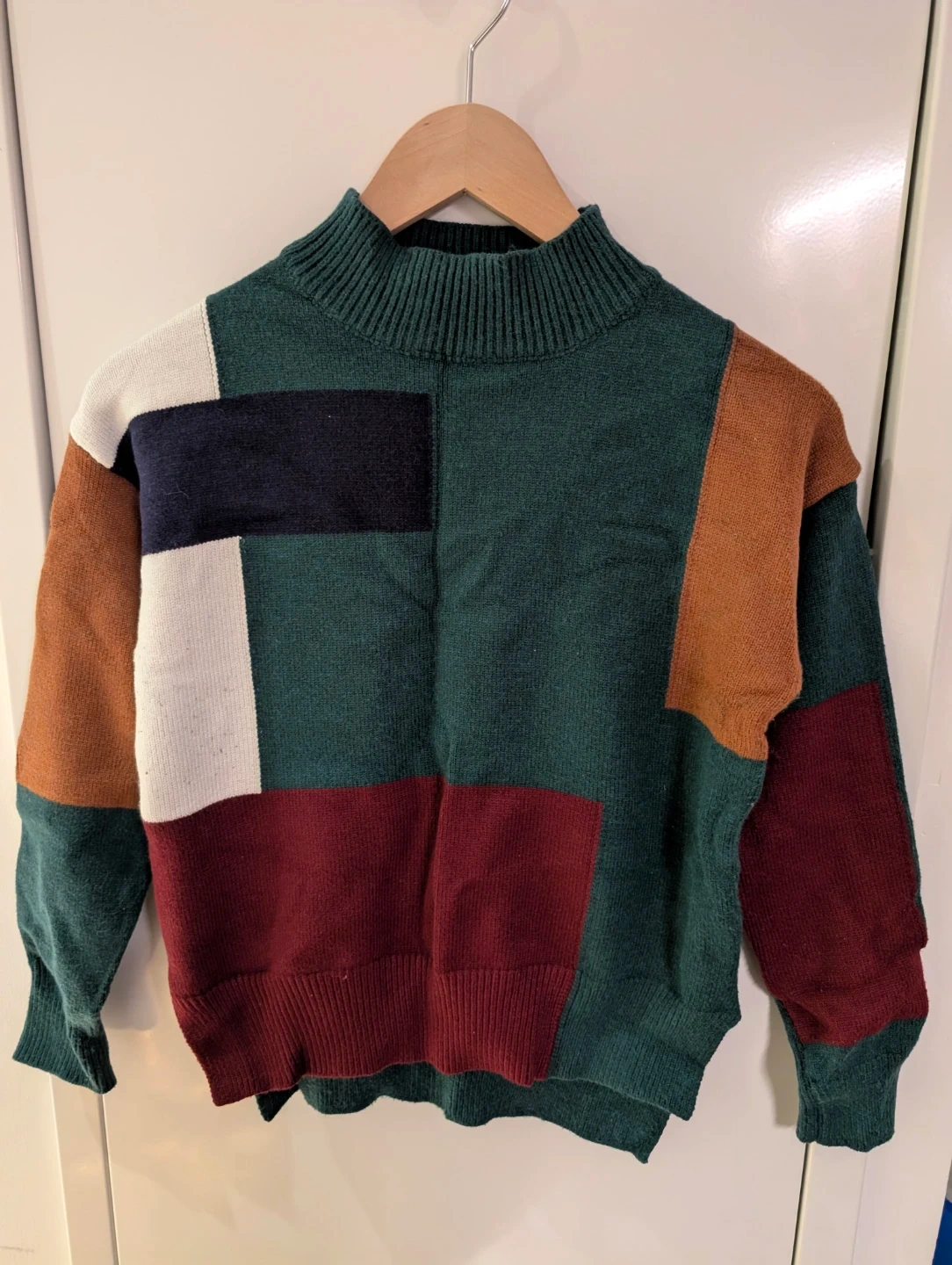 This is a colour block knit sweater. It features a variety of colours including green, navy, white, brown, and red. Perfect for adding a pop of colour to your wardrobe!