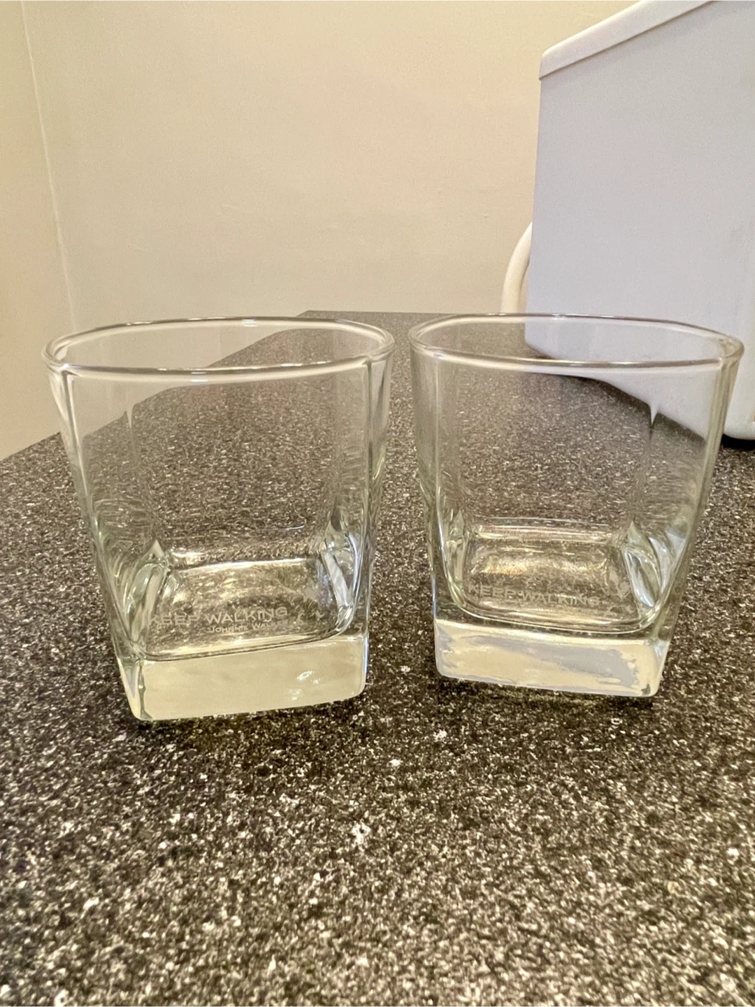 2 Johnnie Walker “keep Walking” square bottom collectible whisky glasses.