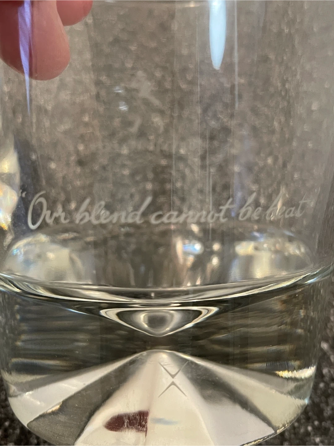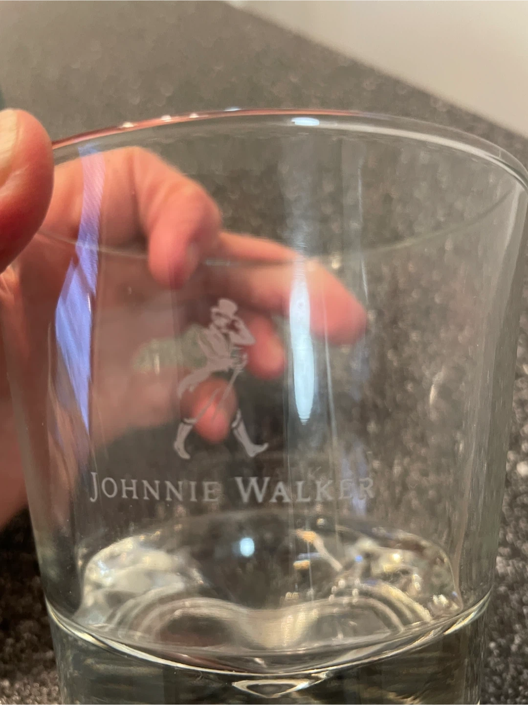 Etching of Johnnie Walker and slogan “ keep walking “ etched on glasses