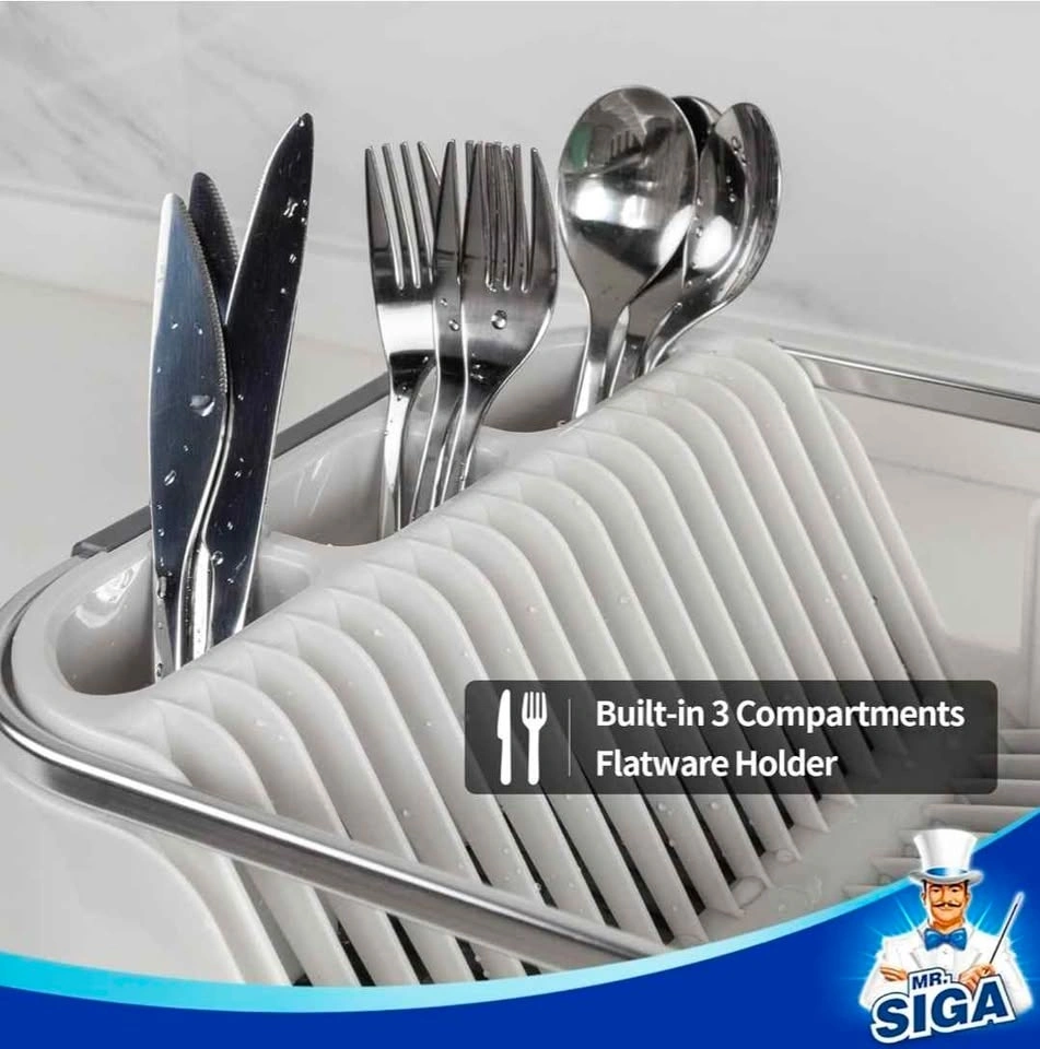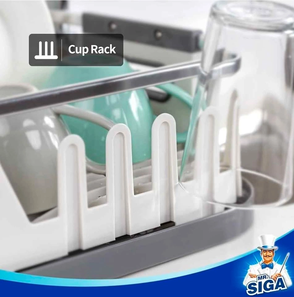 MR.SIGA Dish Drying Rack for Kitchen Counter, Compact Dish Drainer with Drainboard, Utensil Holder and Cup Rack, White