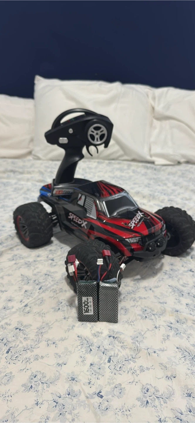 It comes with a remote control, two batteries, and some additional parts, including a spoiler