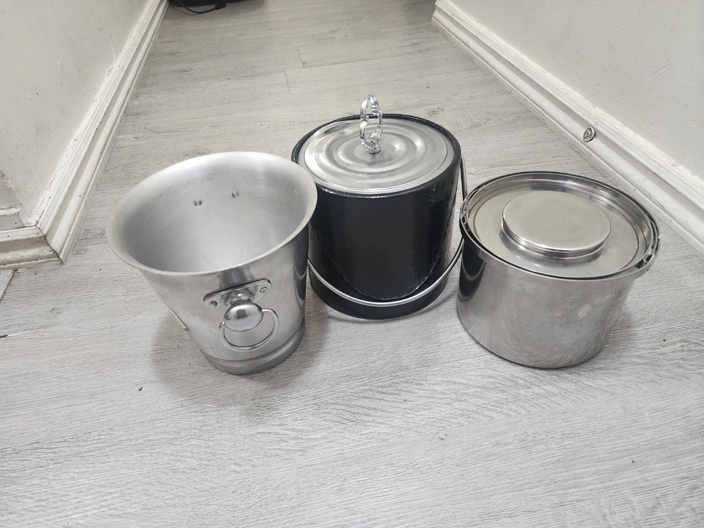 Selling a set of three vintage ice buckets! They are in great shape and ready to keep your drinks cold. Includes some accessories inside one of the buckets as well