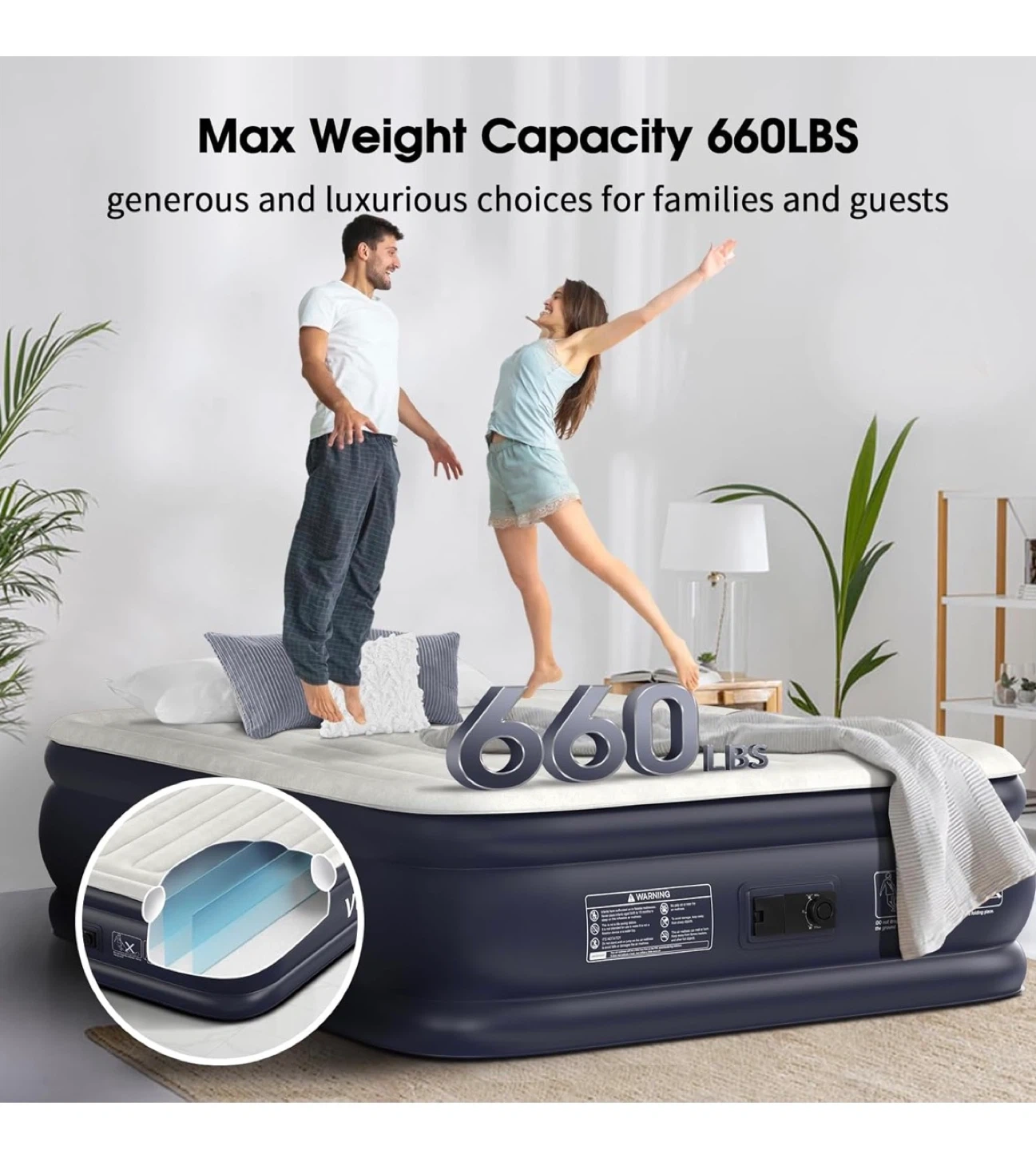It's designed to be as comfortable as a real bed. The side is made of 0.4 mm thickened eco-friendly PVC, and the bottom is non-slip and anti-warp. It's also waterproof and easy to clean. It can hold up to 660 lbs, making it suitable for families and guests