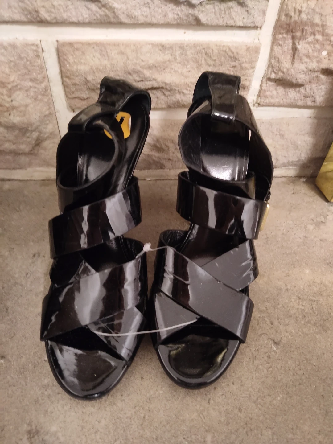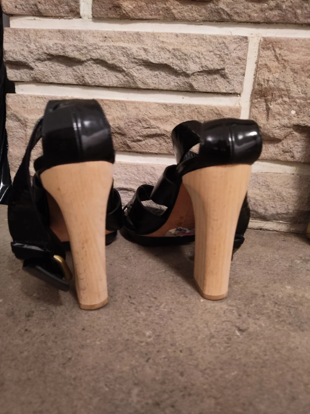 These are a pair of DKNY heels in black. They are a size 8 and have a wooden heel. They show some signs of wear on the soles but are otherwise in good condition