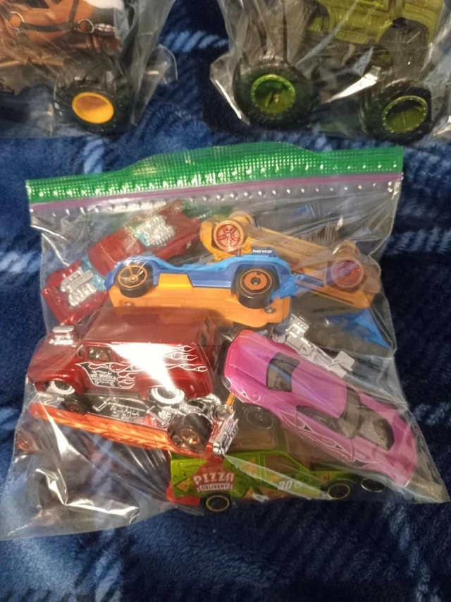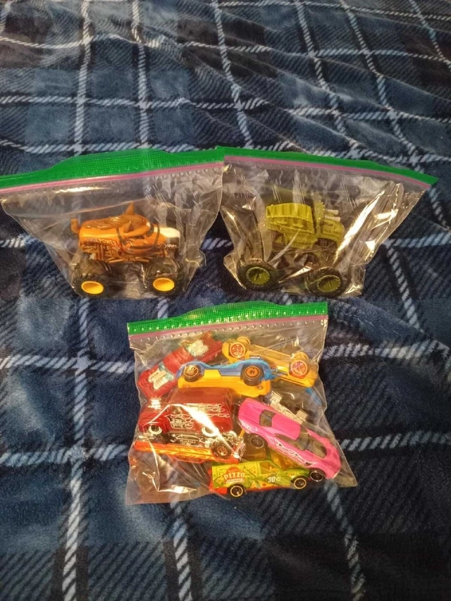 This is a collection of used Hot Wheels cars and Monster Trucks that includes a collection of regular sized hot wheels, and two monster trucks. All are in fantastic condition, as can be seen in the pictures provided. If the ad is still up, they're still available!