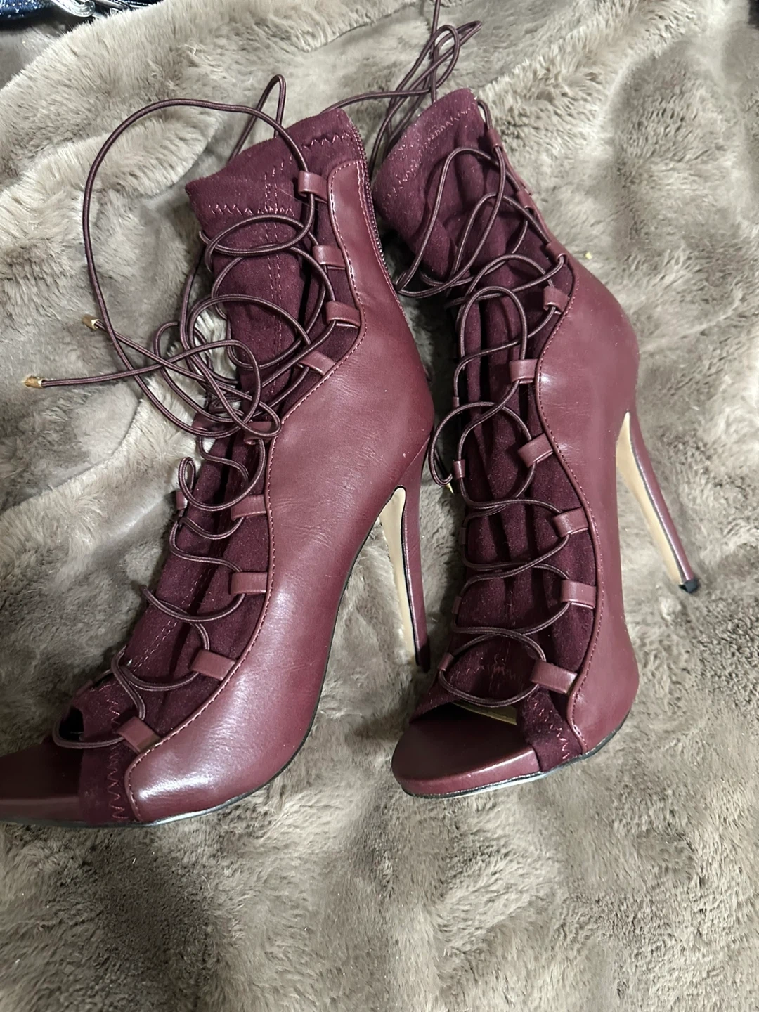 Stylish ShoeDazzle burgundy lace-up heels! These heels are perfect for a night out or a special occasion. They feature a unique lace-up design and a sleek silhouette. Great condition!