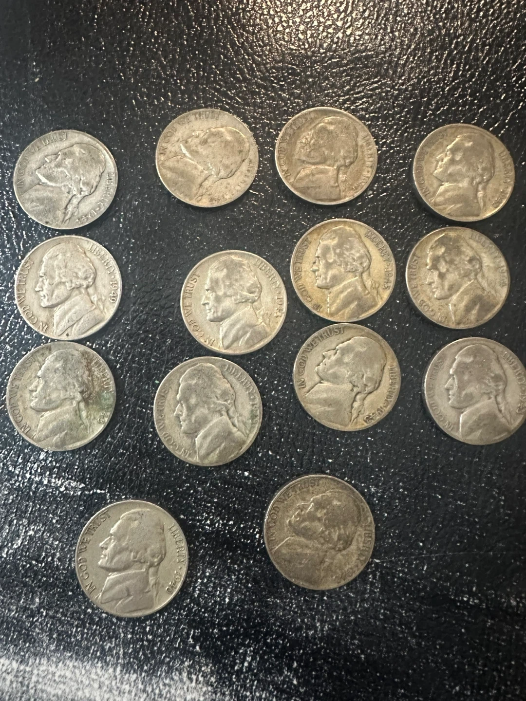Selling a collection of vintage US nickel coins. They show signs of wear consistent with their age, adding to their unique character. A great find for coin collectors! dated 1943..1944 and 1945.. i guess they are 35%